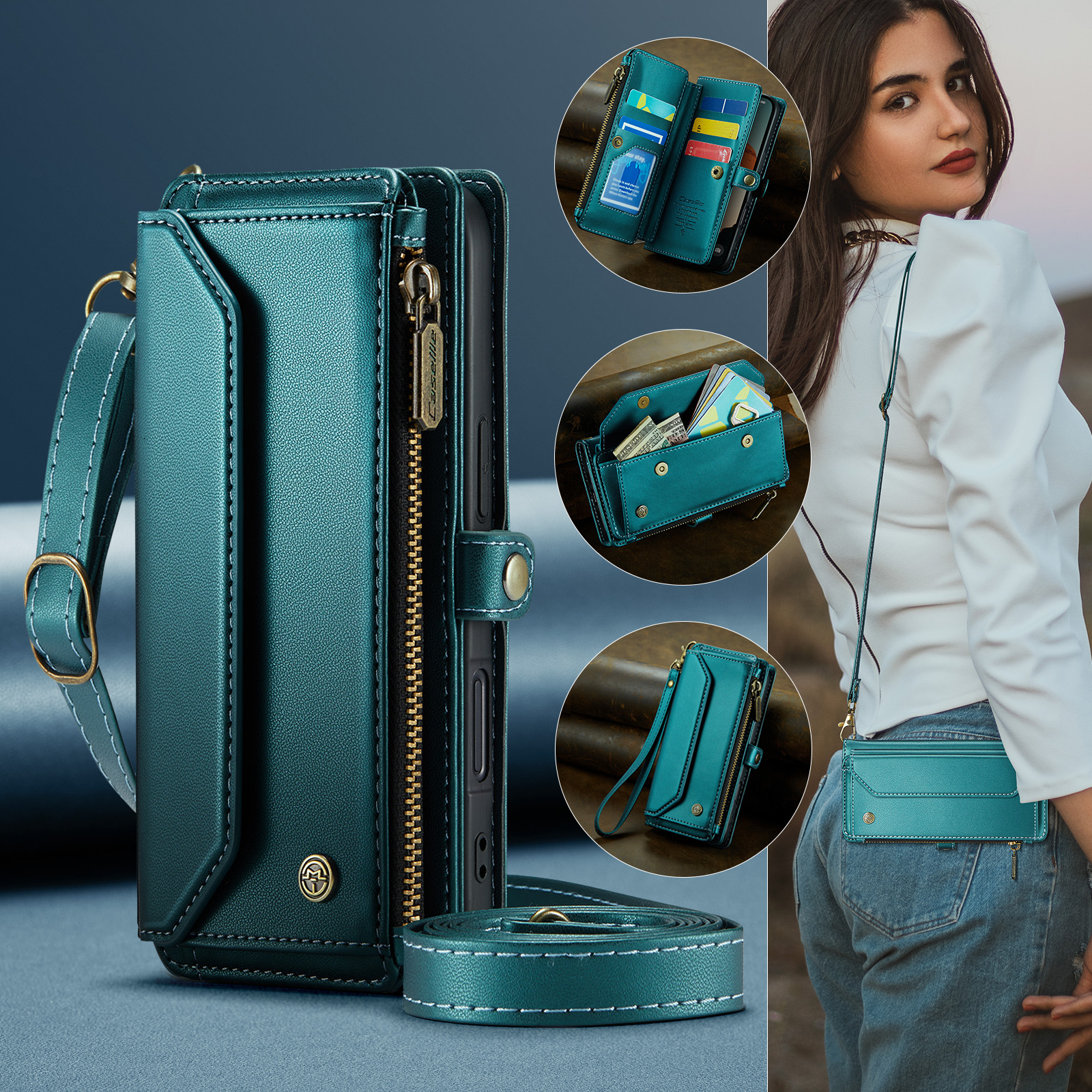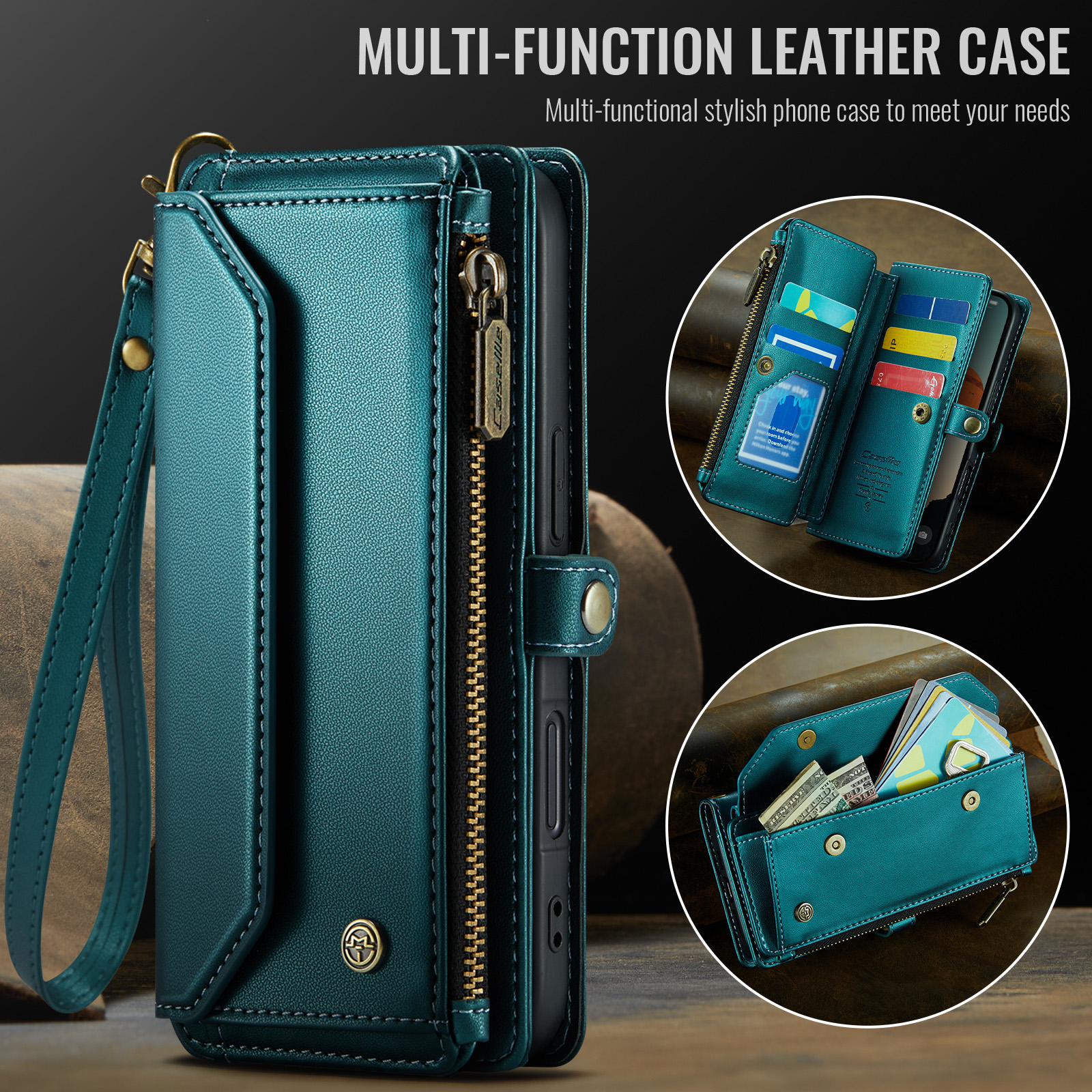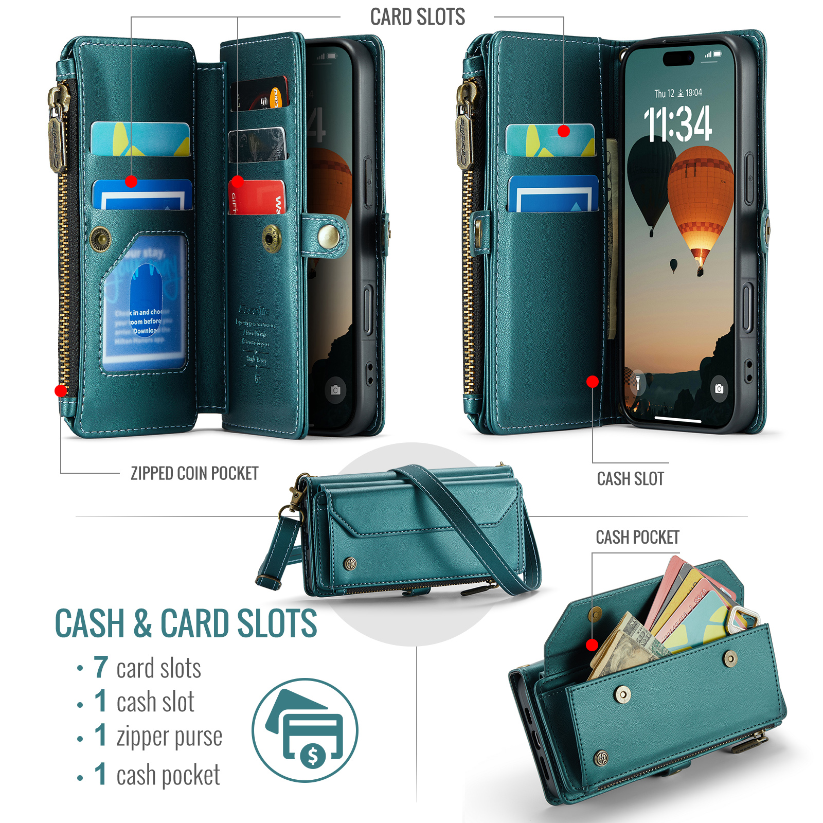 For iPhone 17 Pro Leather Case CASEME C36 Zipper 10 Card Slots Phone Cover with Straps – Green