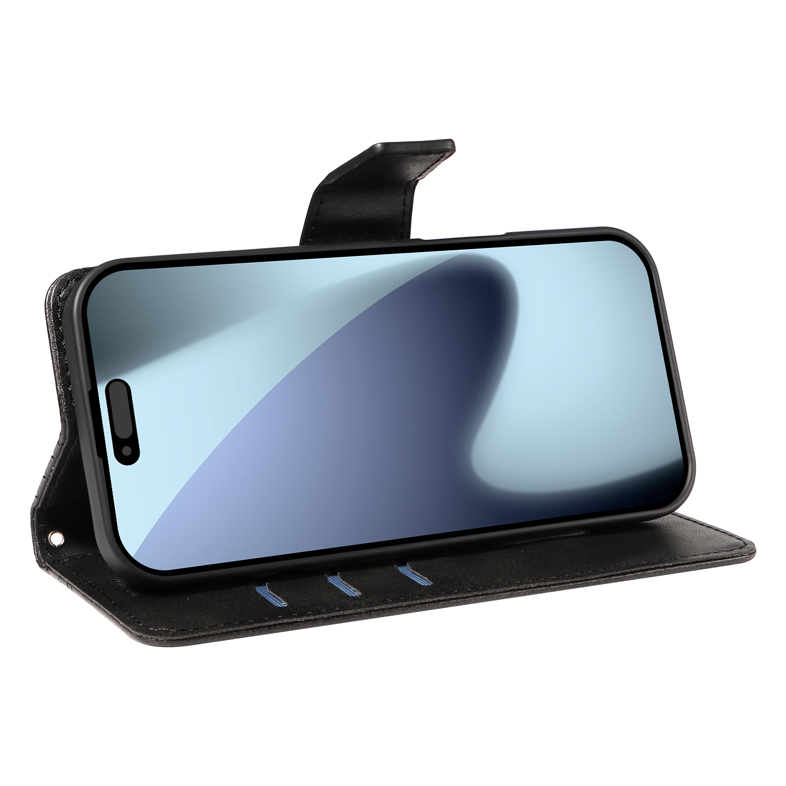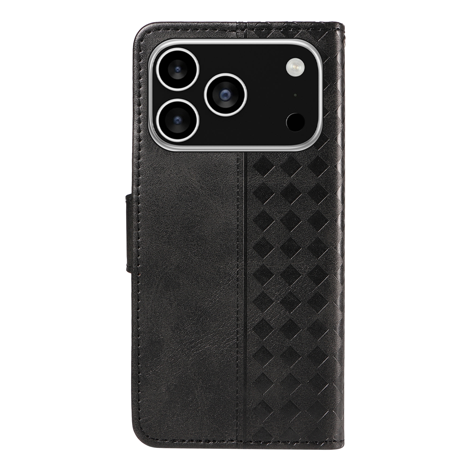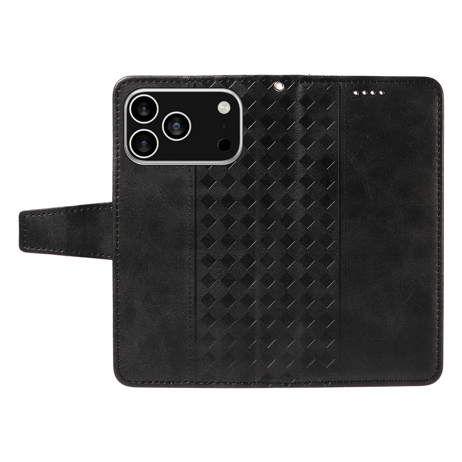 For iPhone 17 Pro Leather Case Wallet Stand Grids Imprinted Phone Cover with Strap – Black