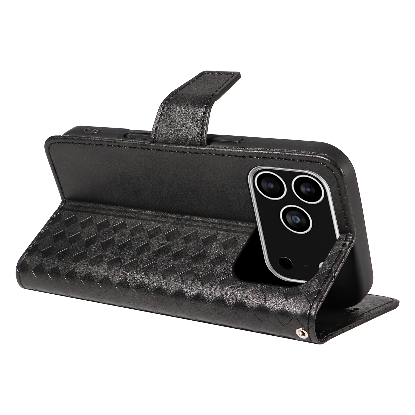 For iPhone 17 Pro Leather Case Wallet Stand Grids Imprinted Phone Cover with Strap - Black $16.71