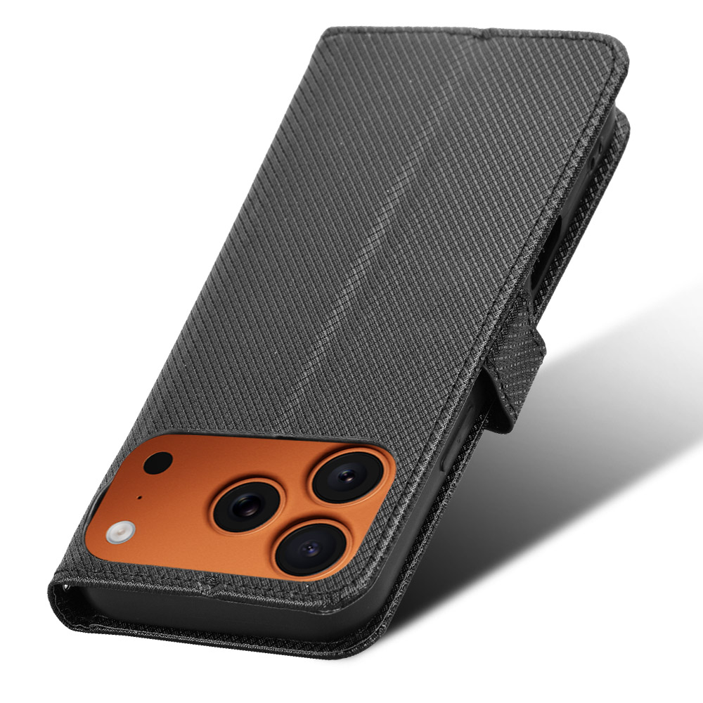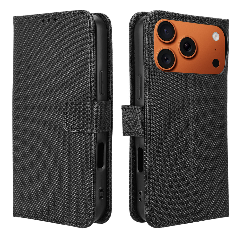 For iPhone 17 Pro Leather Wallet Case with Strap Diamond Texture Phone Cover – Black