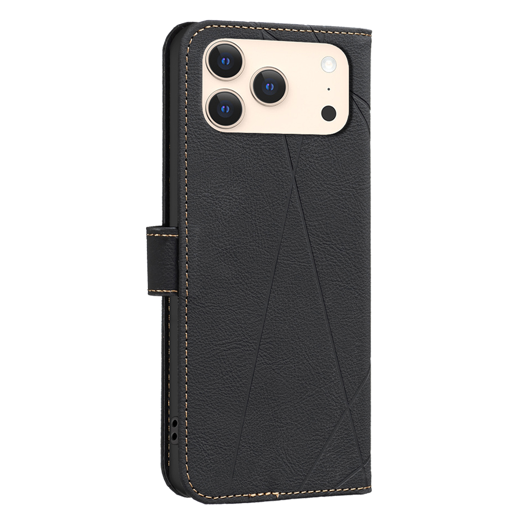 For iPhone 17 Pro Max Case BINFEN COLOR BF35 Geometry Imprinted Leather Phone Cover RFID Blocking Wallet Stand – Black