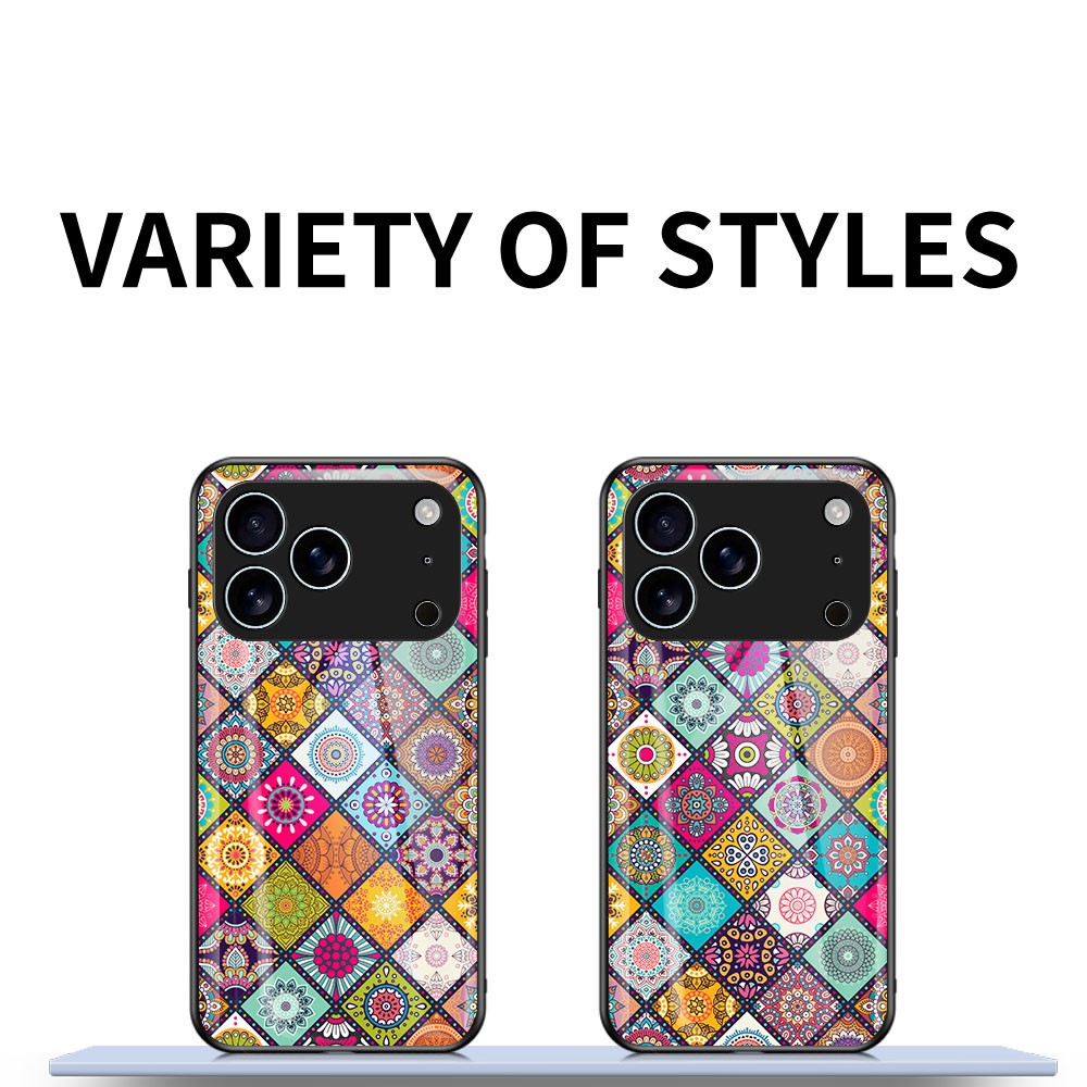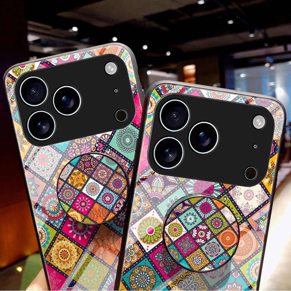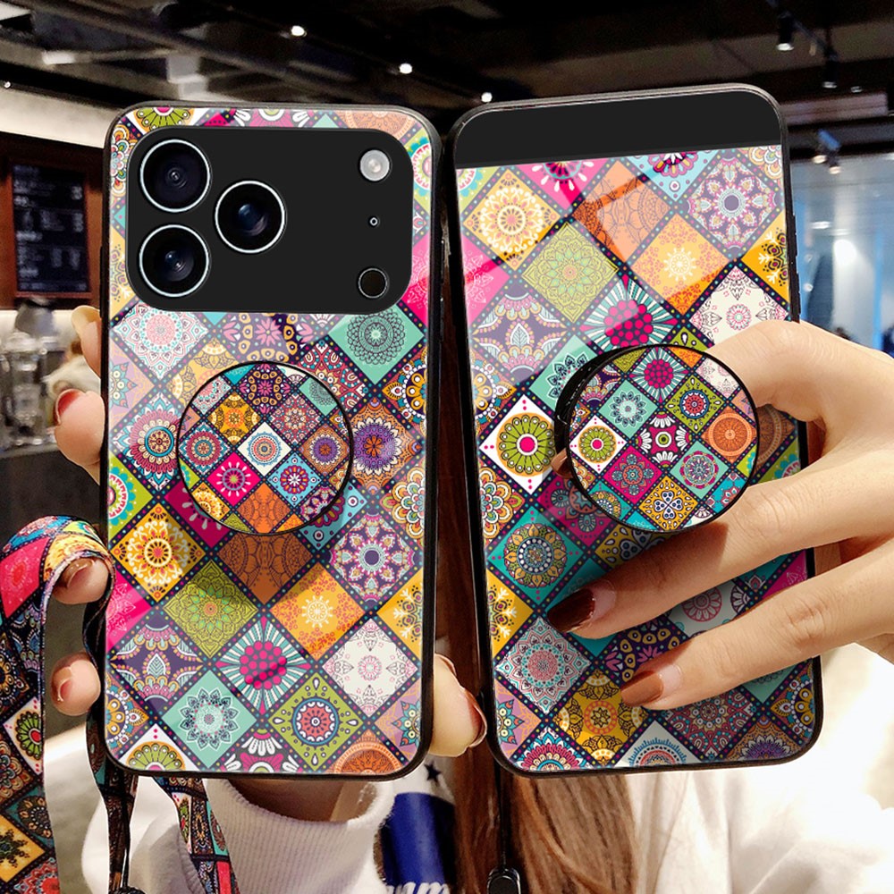 • For iPhone 17 Pro Max Case Kickstand Ethnic Pattern Tempered Glass Phone Cover with Strap - Color Pattern