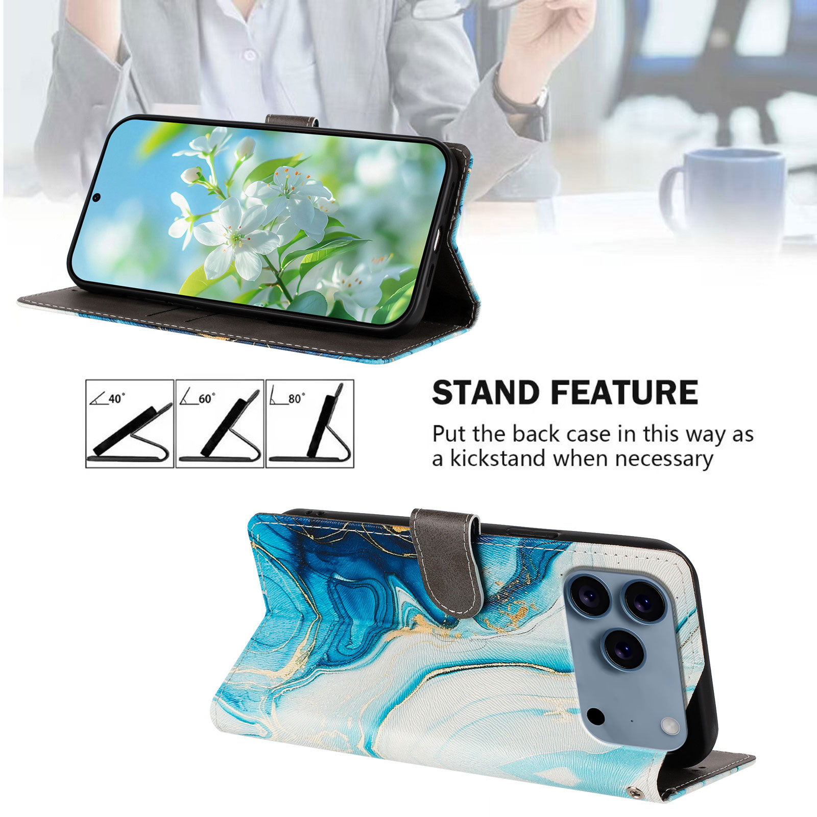 For iPhone 17 Pro Max Case Pattern Print PU Leather Wallet Phone Cover with Wrist Strap - Blue Marble