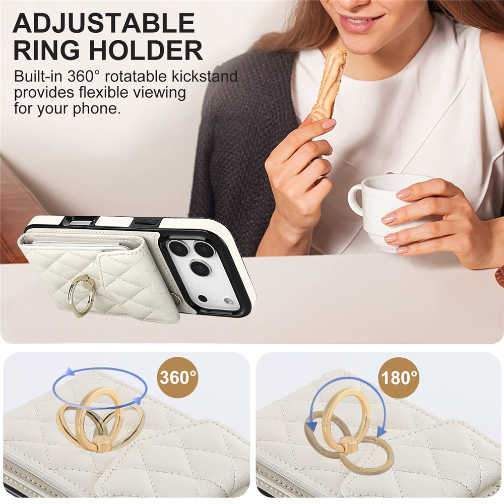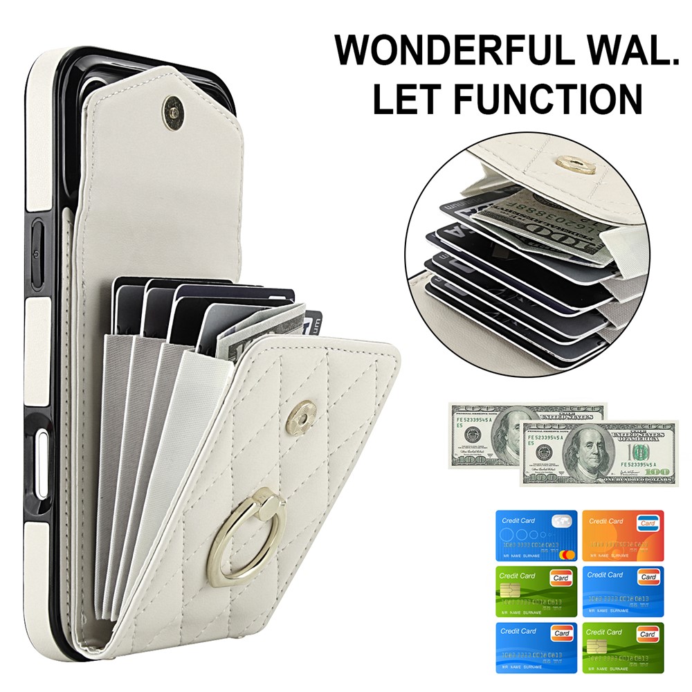 - Accordion-Style Card Holder The back of the case features an accordion-style cardholder with a magnetic button closure, perfect for storing essential cards and cash securely