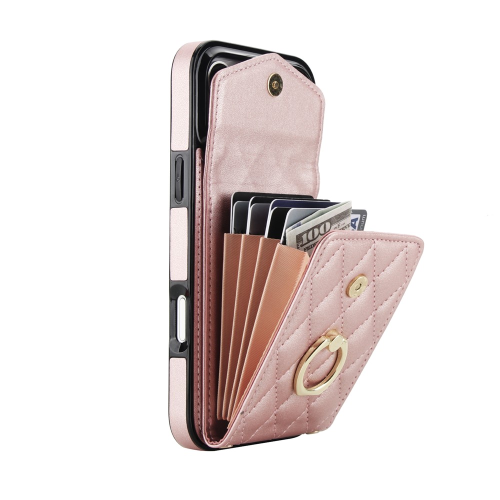 - Accordion-Style Card Holder The back of the case features an accordion-style cardholder with a magnetic button closure, perfect for storing essential cards and cash securely