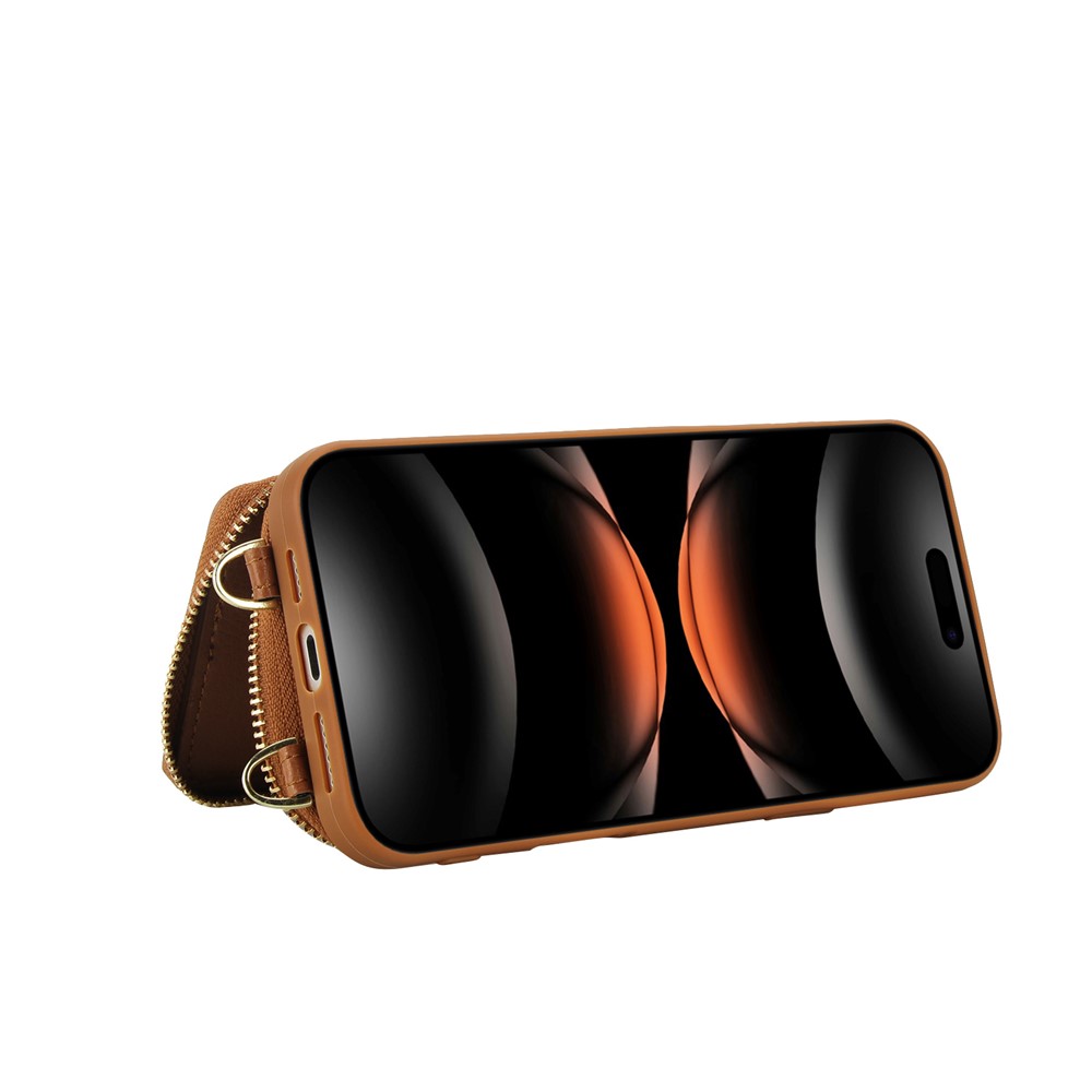 For iPhone 17 Pro Max Case RFID Blocking Zipper Wallet Leather + TPU Phone Cover with Shoulder Strap – Brown