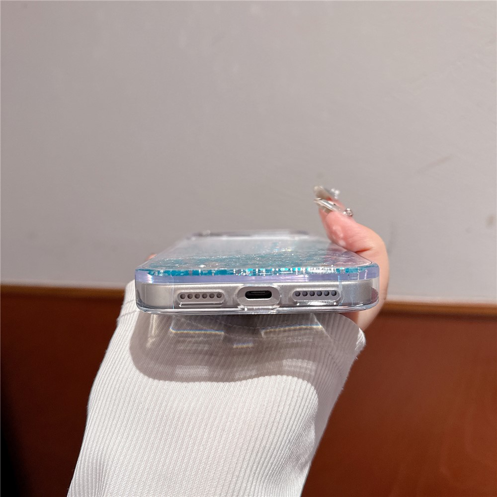 - Silver-blue Glitter Flowing Sand Effect Unique quicksand design creates a dynamic, eye-catching effect that enhances your phone’s appearance