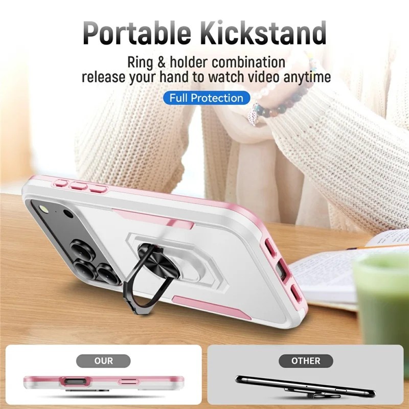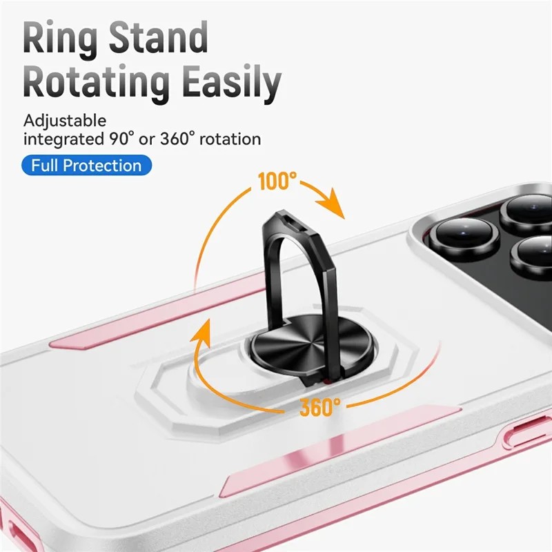- 360 Degree Rotating Ring Kickstand Integrated ring holder rotates 360 degrees and flips 100 degrees, serving as a secure grip or kickstand for hands-free viewing.