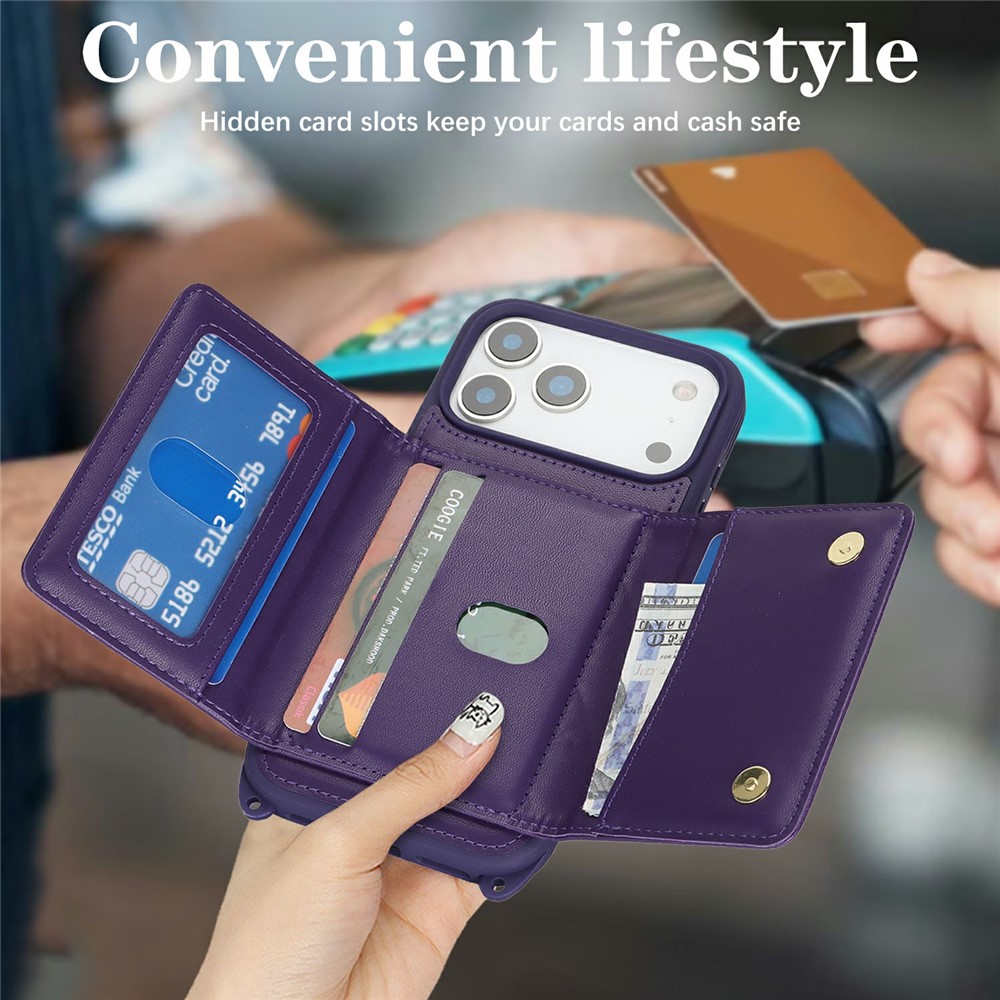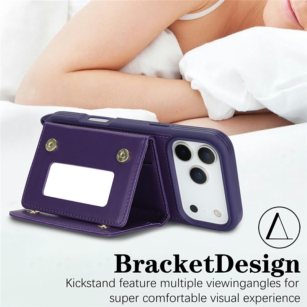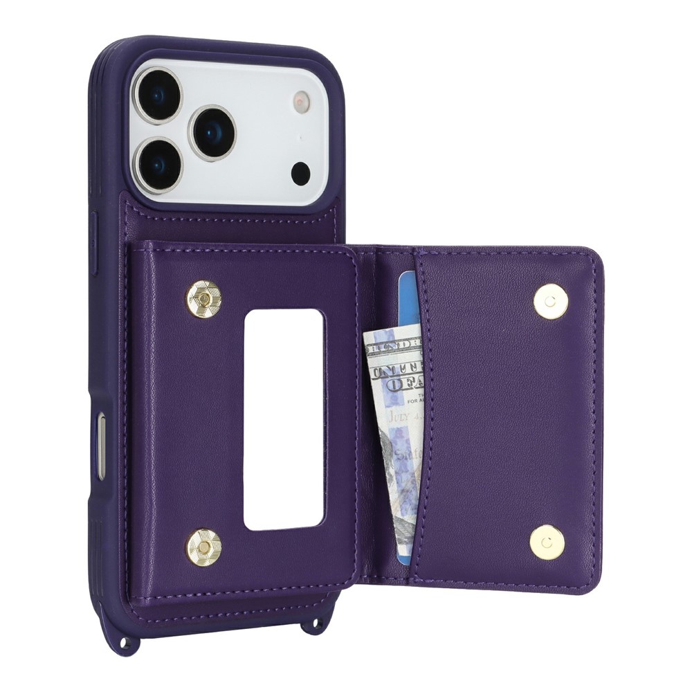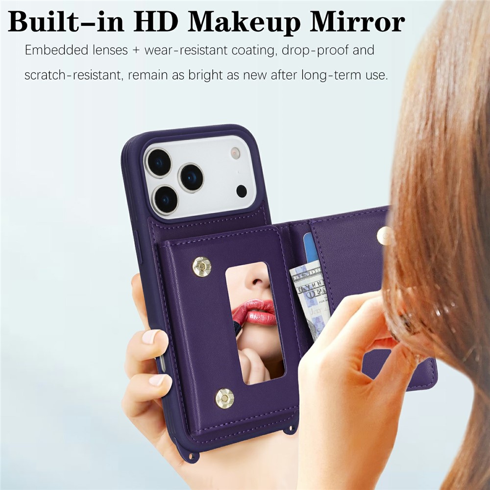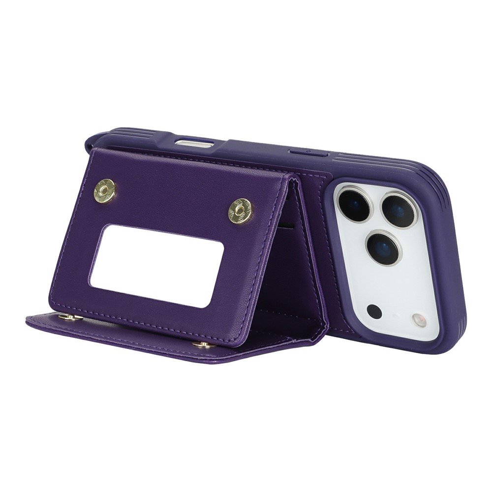 For iPhone 17 Pro Max Case with Lanyard  /  Mirror  /  Card Holder Grids Pattern RFID Blocking Phone Cover - Purple