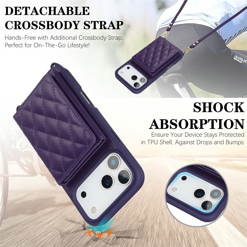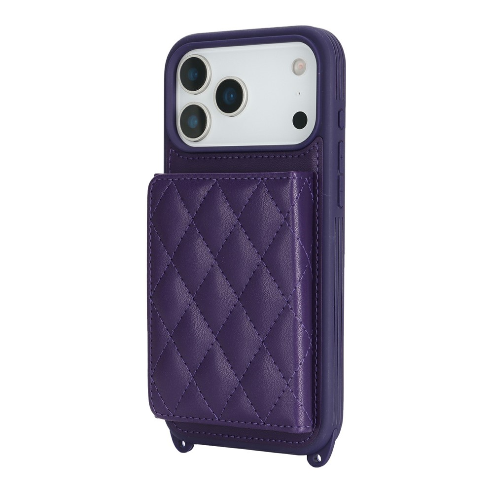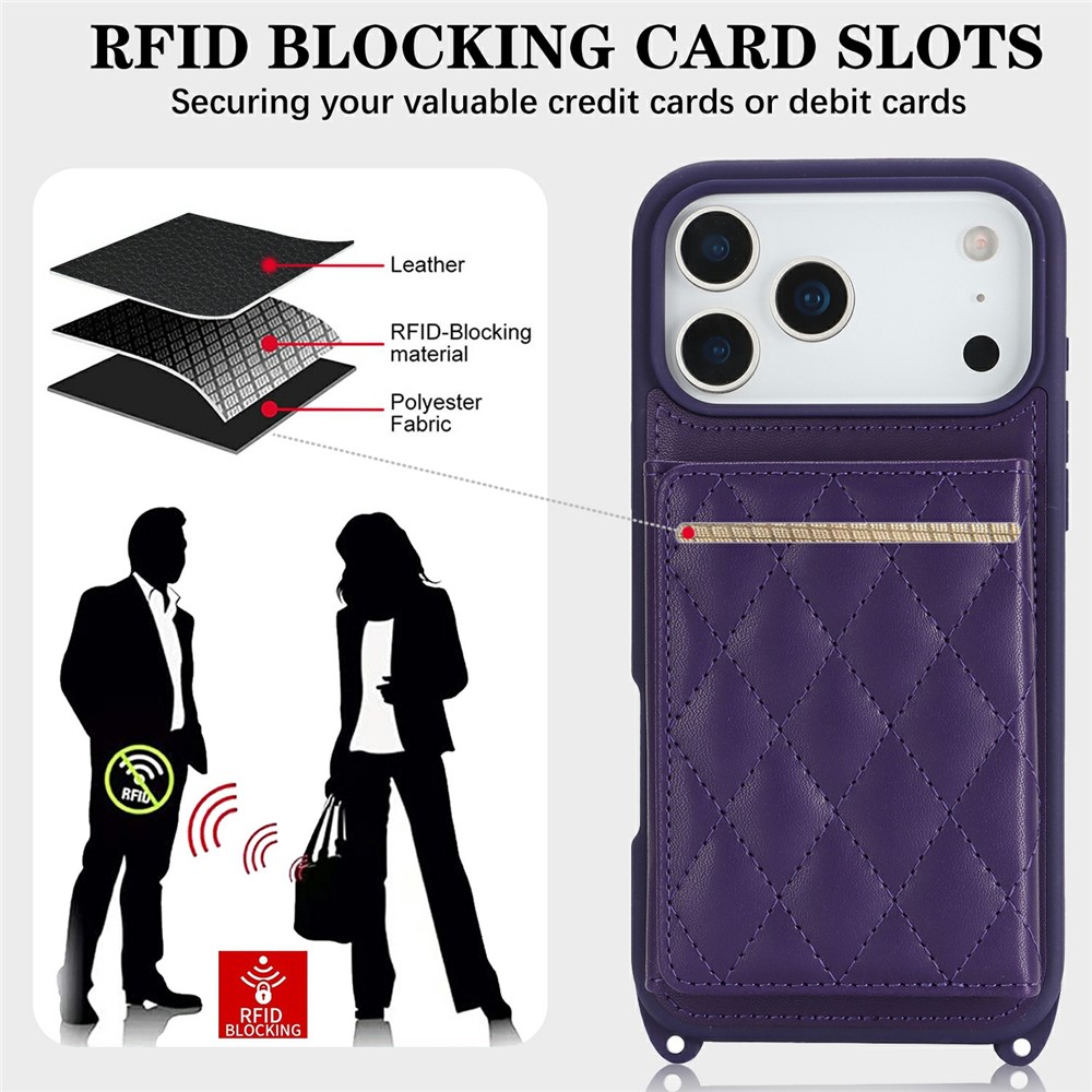 For iPhone 17 Pro Max Case with Lanyard / Mirror / Card Holder Grids Pattern RFID Blocking Phone Cover - Purple $26.63