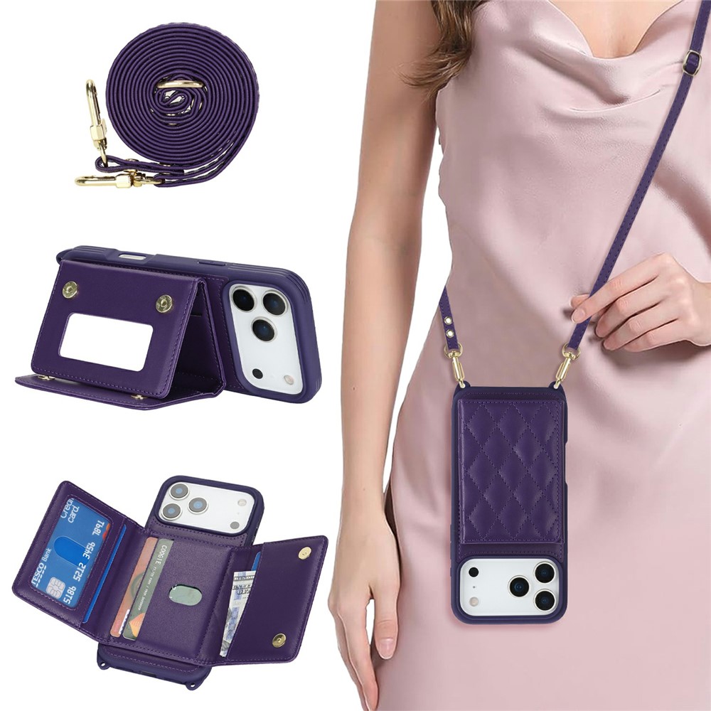 For iPhone 17 Pro Max Case with Lanyard / Mirror / Card Holder Grids Pattern RFID Blocking Phone Cover – Purple
