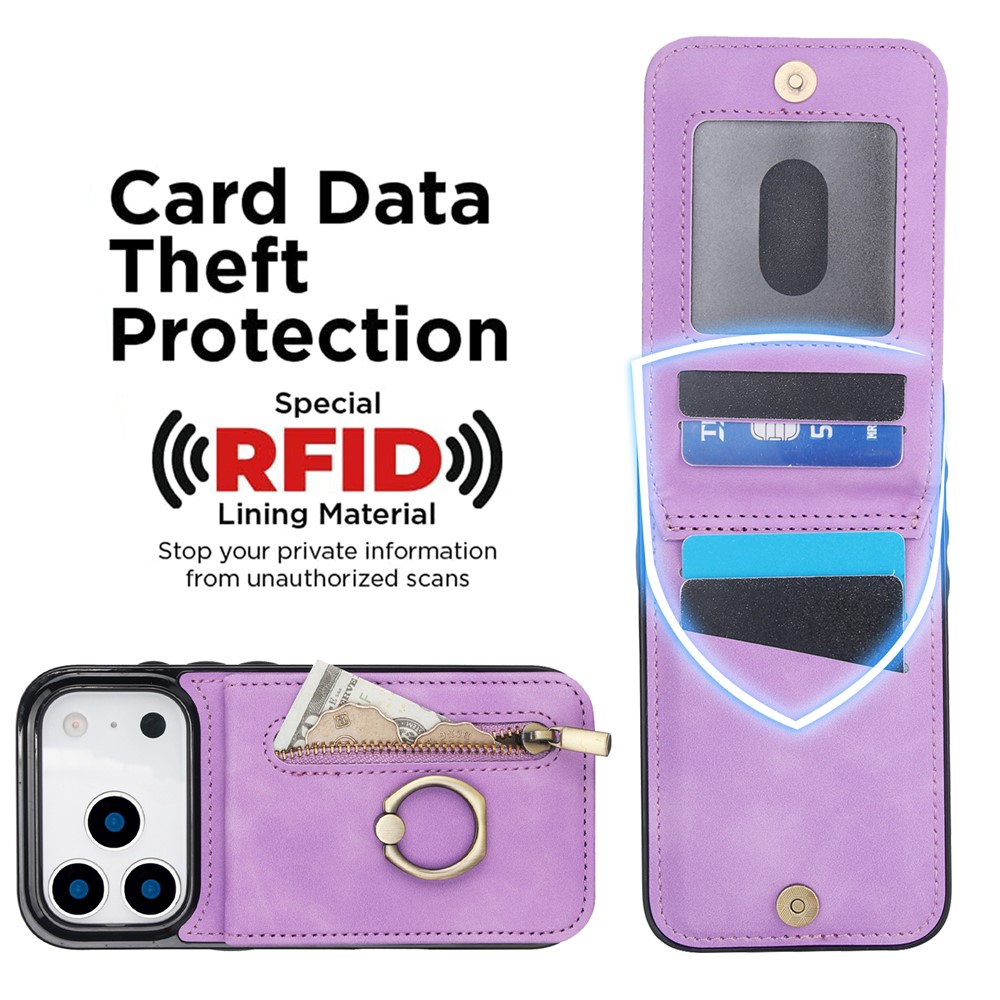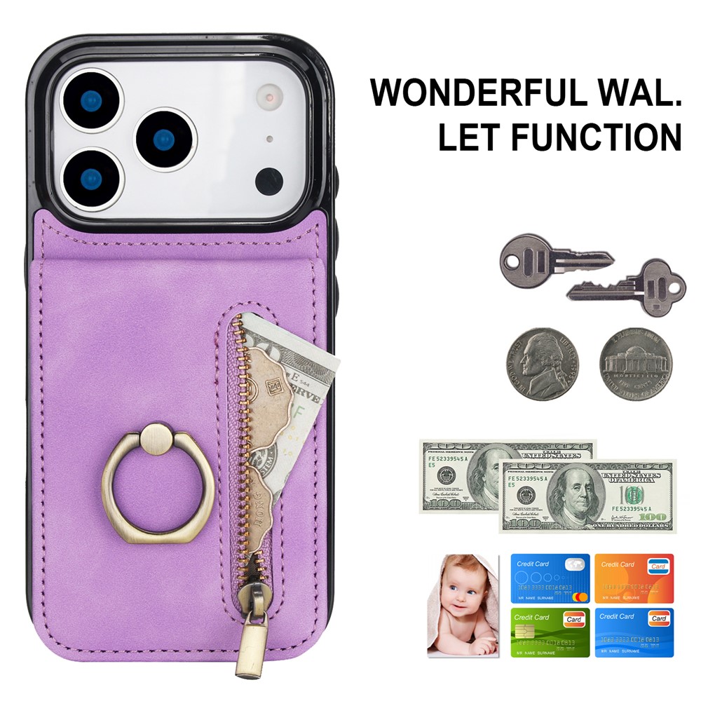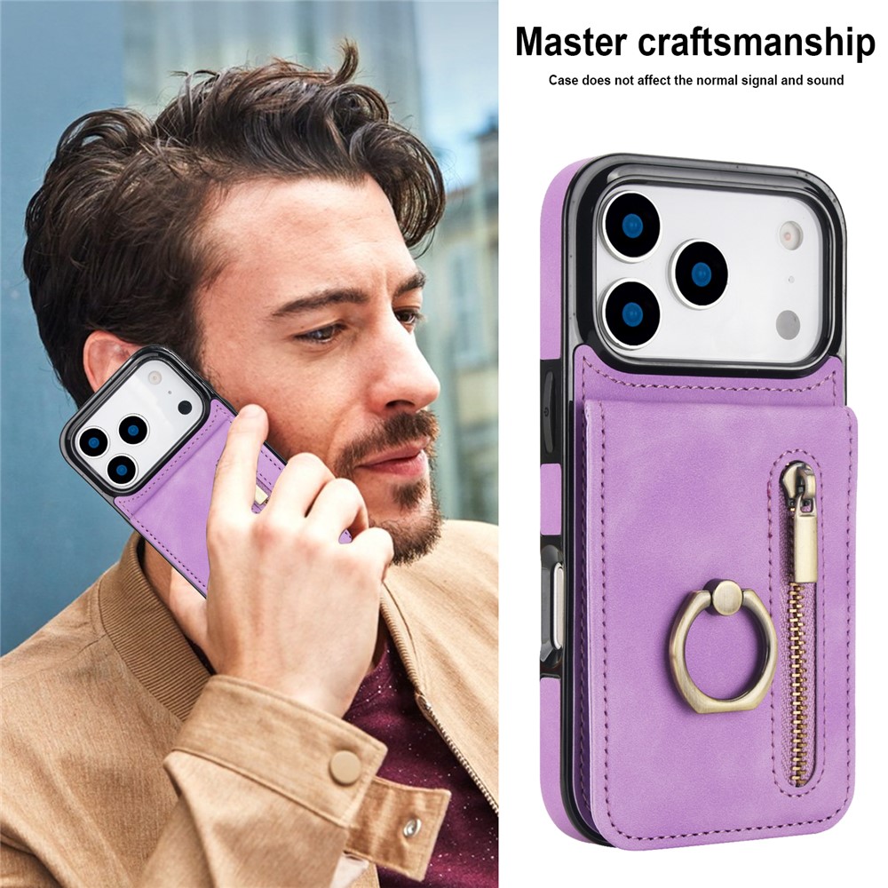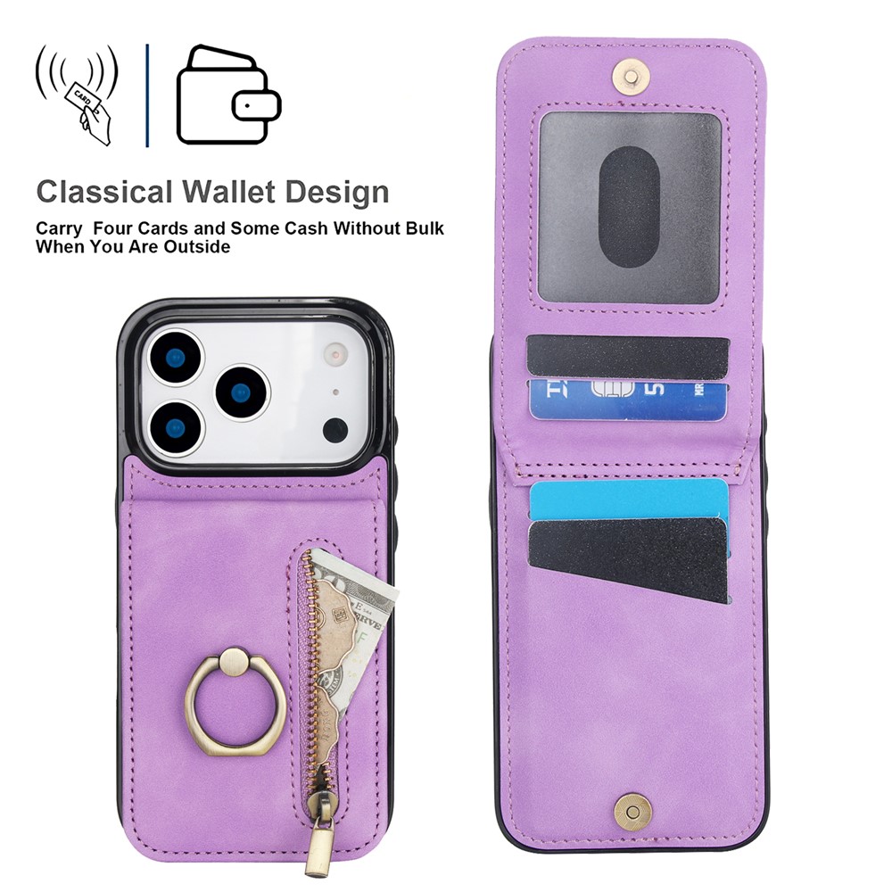 For iPhone 17 Pro Max Case Zipper RFID Blocking Retro Leather + TPU Phone Cover with Kickstand – Purple