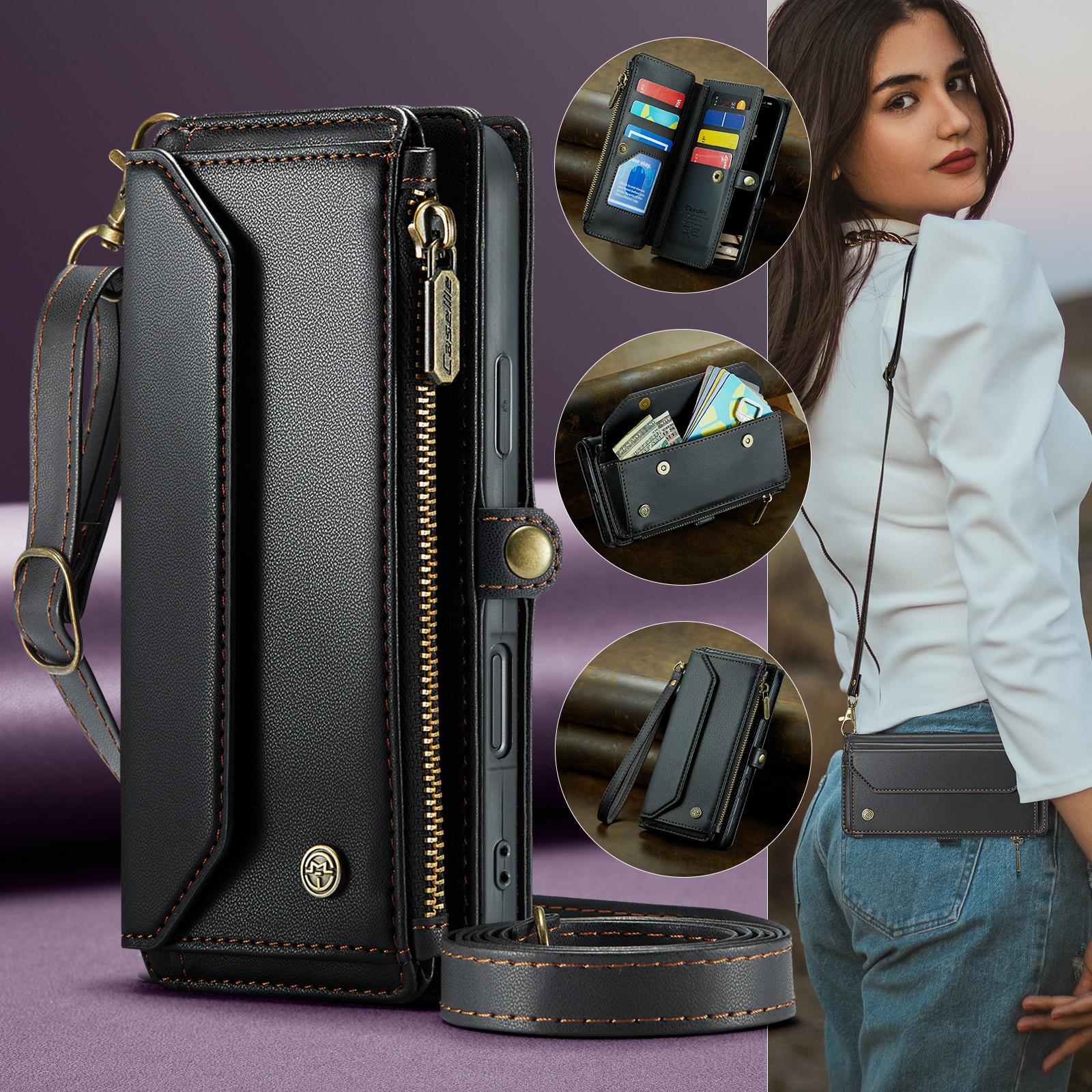 For iPhone 17 Pro Max Leather Case CASEME C36 Zipper 10 Card Slots Phone Cover with Straps - Black $26.35