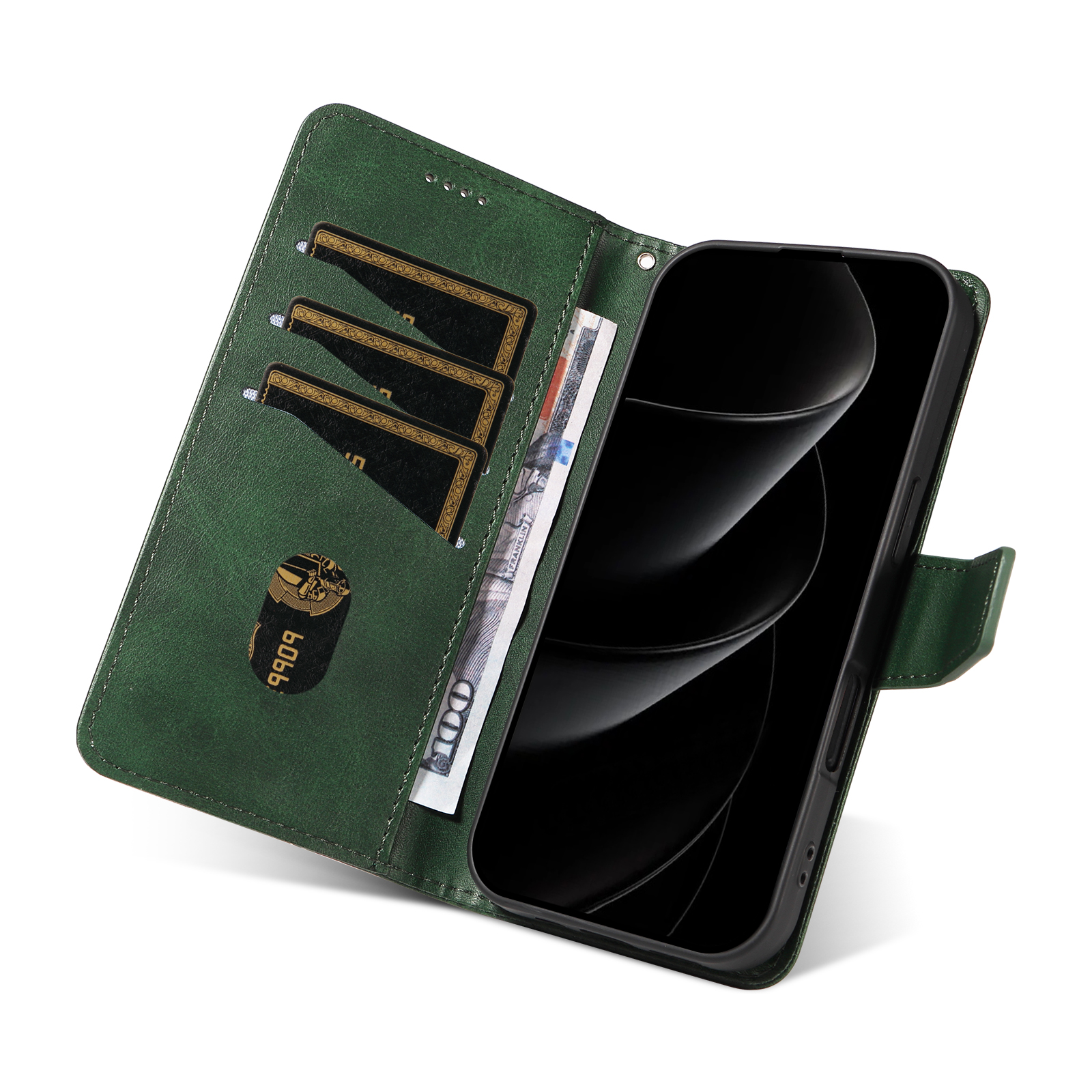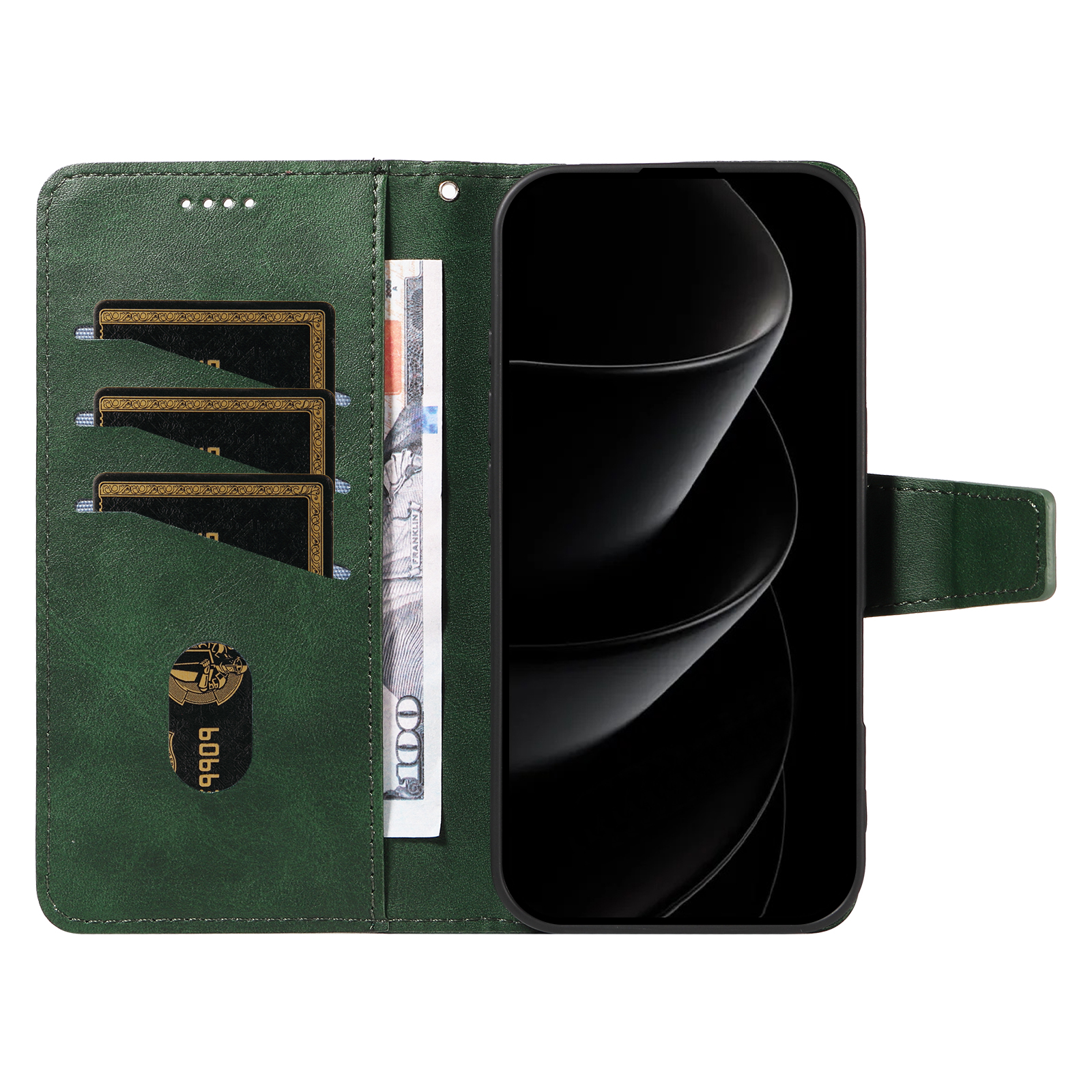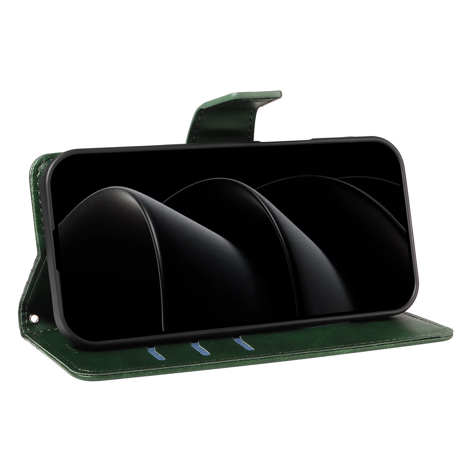 For iPhone 17 Pro Max Leather Case Wallet Stand Grids Imprinted Phone Cover with Strap – Green