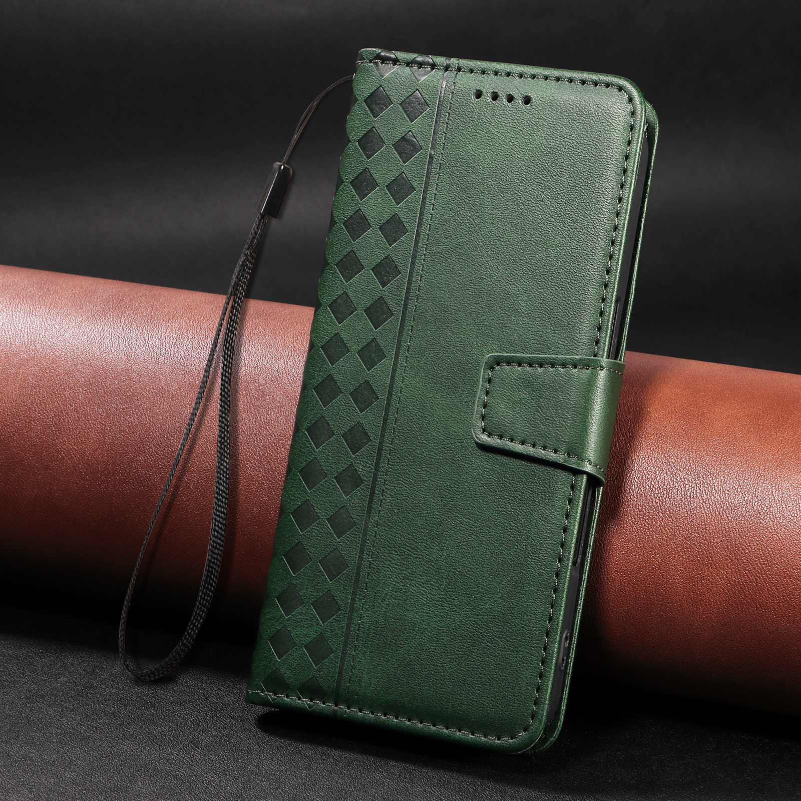 For iPhone 17 Pro Max Leather Case Wallet Stand Grids Imprinted Phone Cover with Strap - Green $16.71
