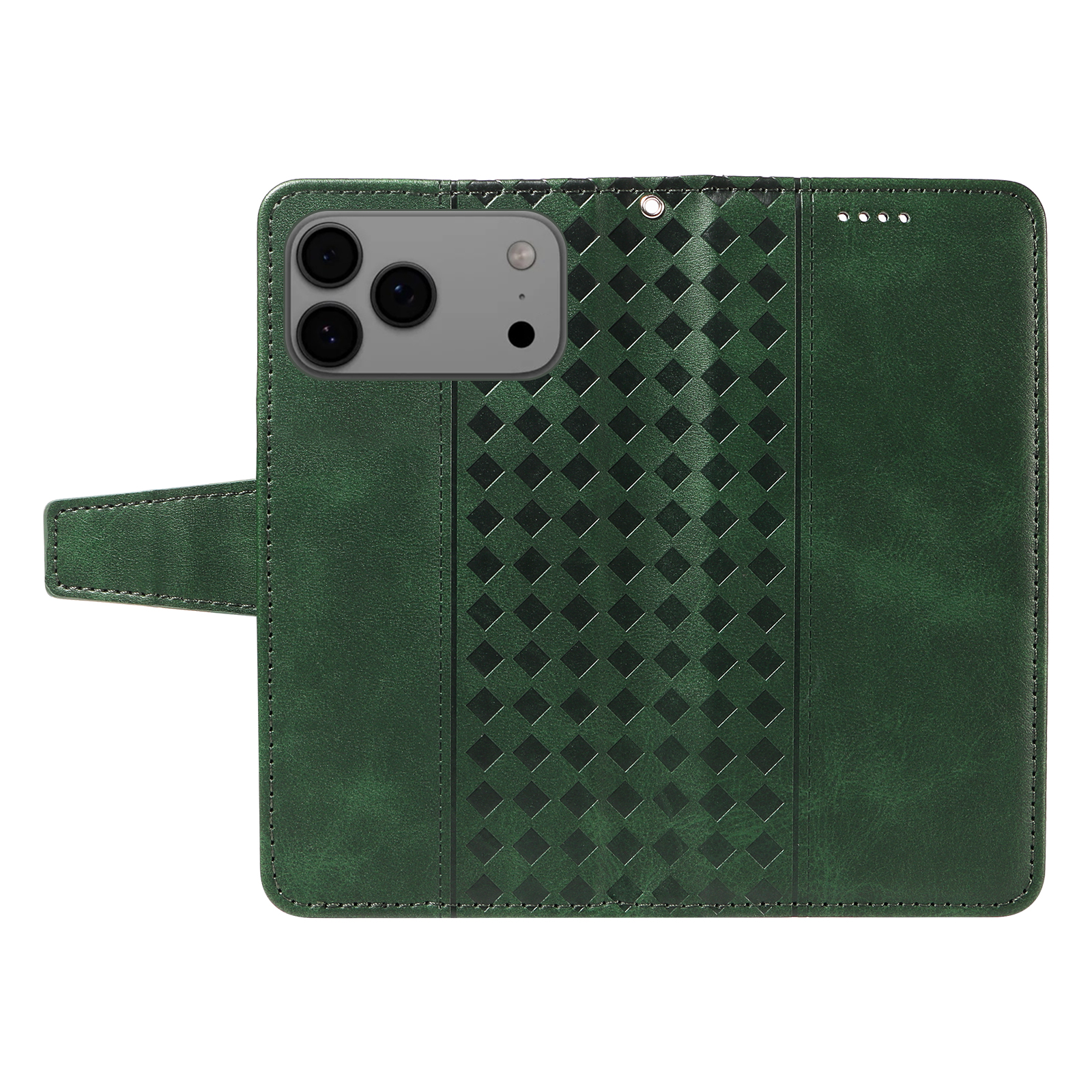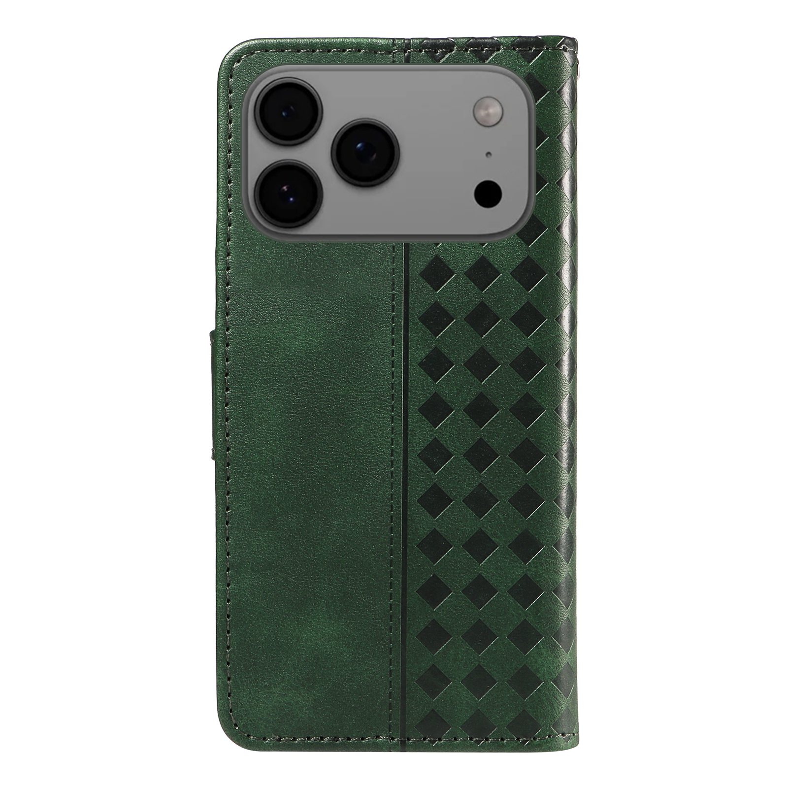 For iPhone 17 Pro Max Leather Case Wallet Stand Grids Imprinted Phone Cover with Strap - Green