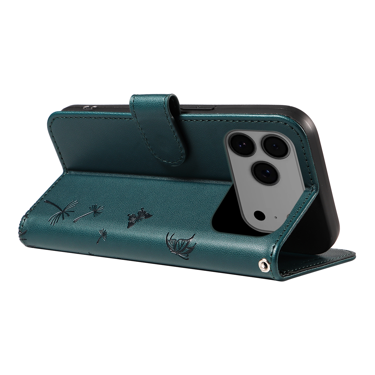 • For iPhone 17 Pro Max Leather Wallet Case with Strap Dandelion Imprint Phone Stand Cover - Green