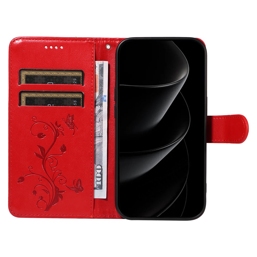 For iPhone 17 Pro Max PU Leather Cases Flower Pattern Wallet Stand Phone Cover with Strap – Red