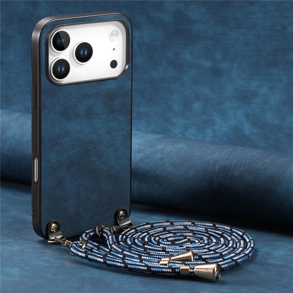 For iPhone 17 Pro Max Retro Leather Phone Back Cover with Adjustable Strap – Blue