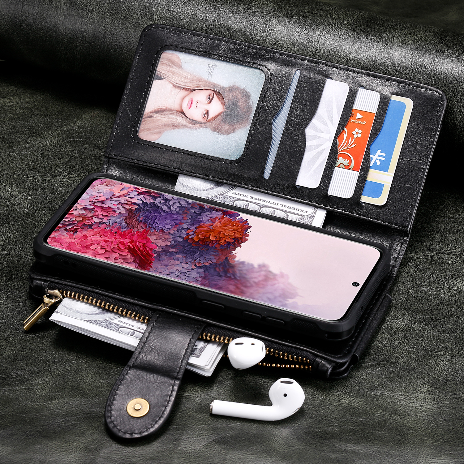 - Spacious Storage for Cards, Cash Equipped with multiple card slots, an inner cash pocket, and a secure zipper pocket, this multifunctional case provides ample storage space for credit cards, IDs, bills, and small essentials.
