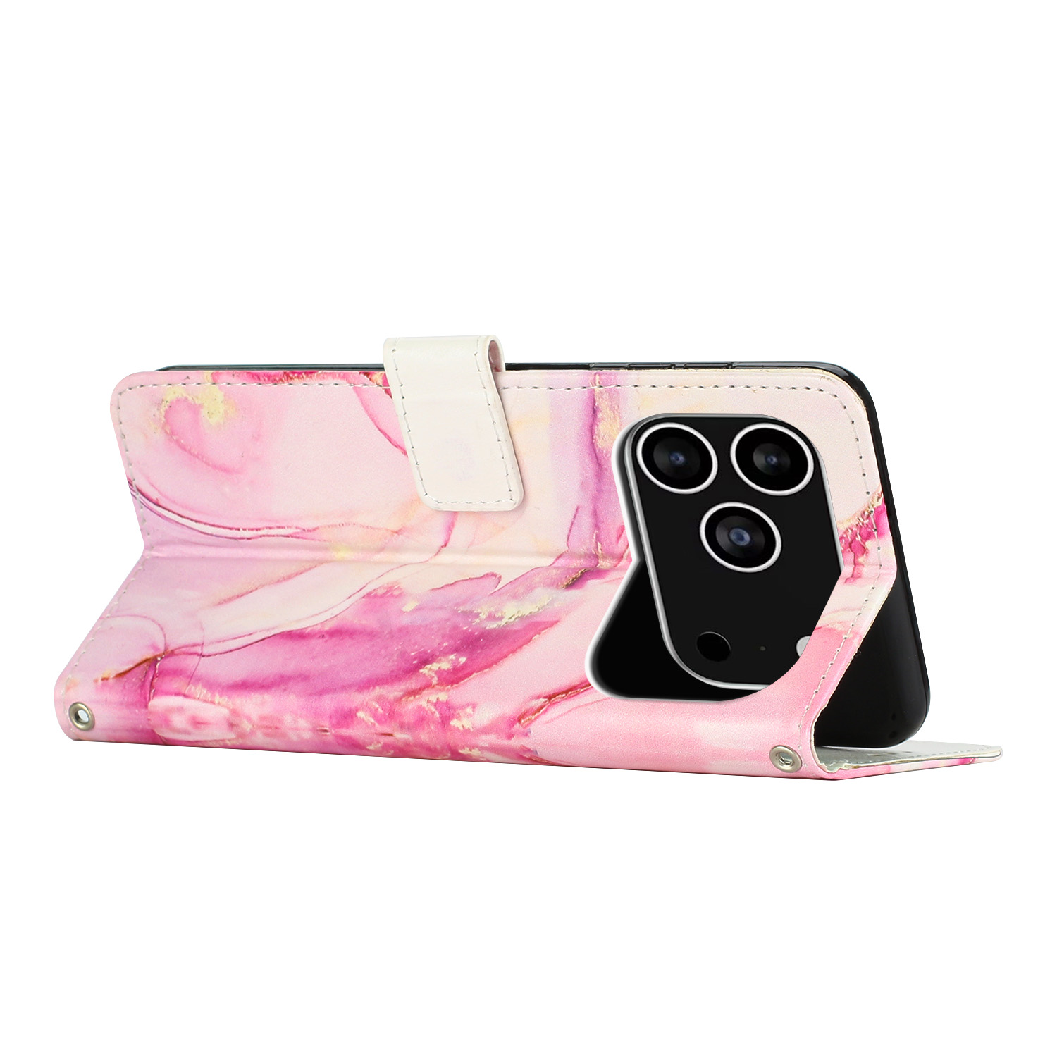 • For iPhone 17 Pro Stand Case Marble Pattern PU Leather Wallet Phone Cover - Pink / Purple