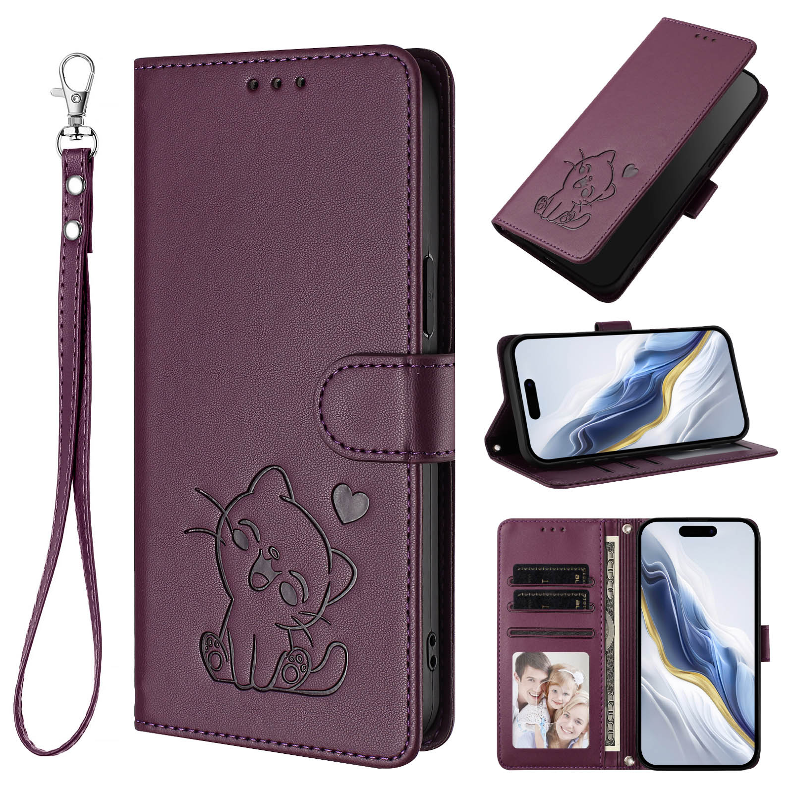 For iPhone 17 Pro Wallet Case with Wrist Strap Love Cat Pattern Imprint Leather Phone Cover - Purple $16.72