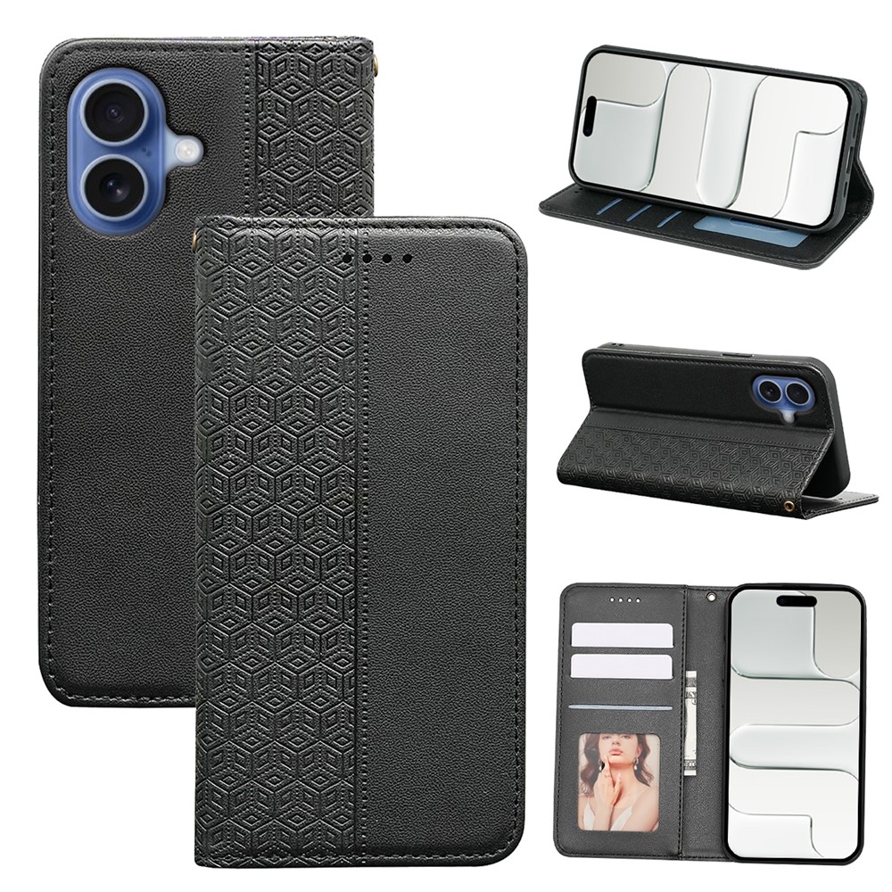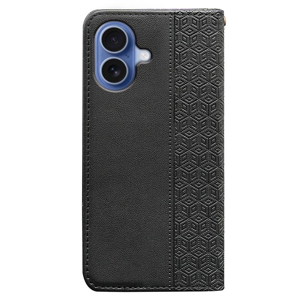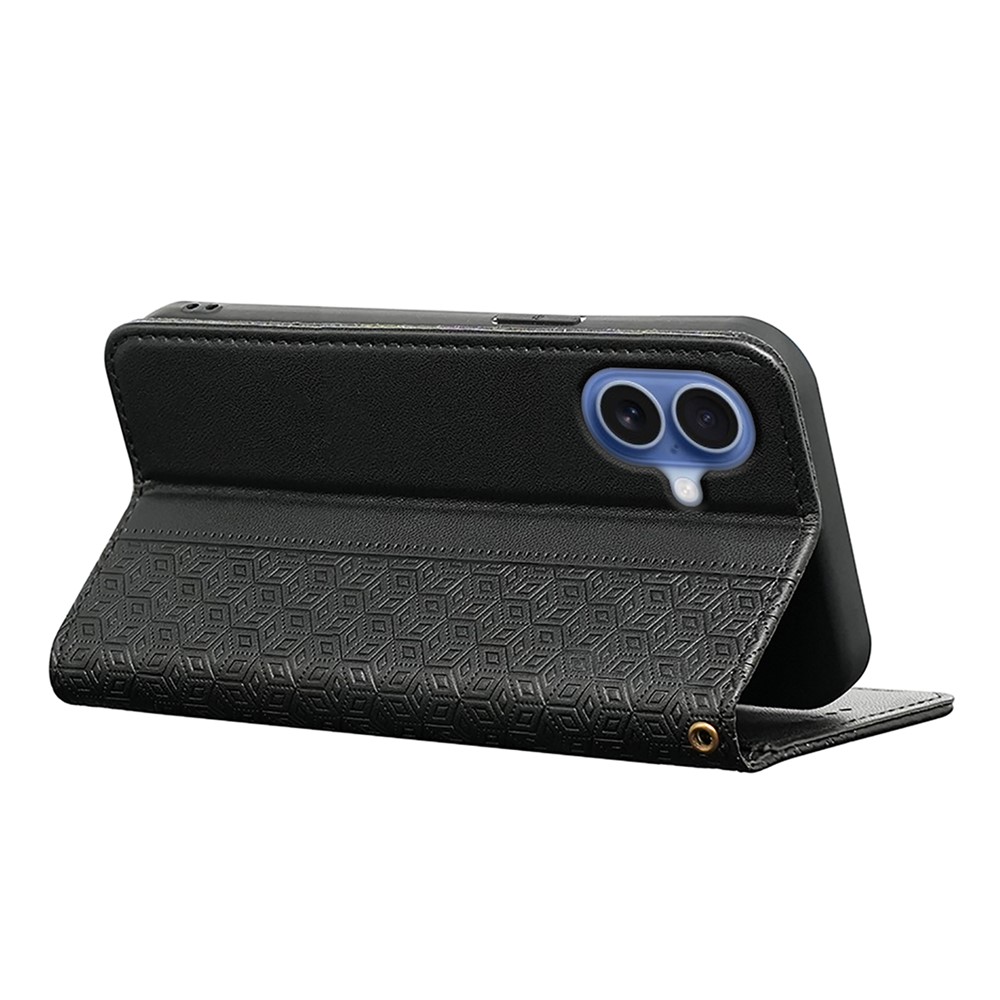 For iPhone 17 Wallet Phone Case Checkered Pattern Imprint Leather Flip Cover with Wrist Strap – Black