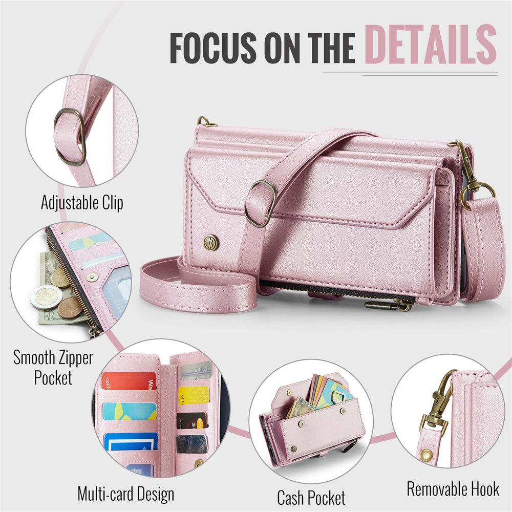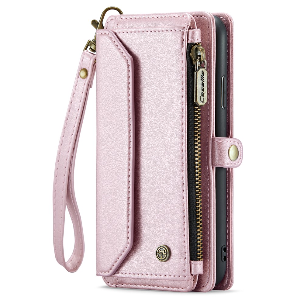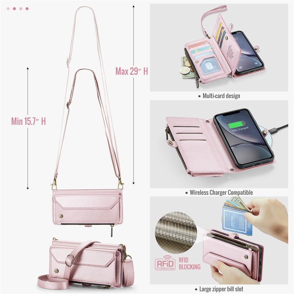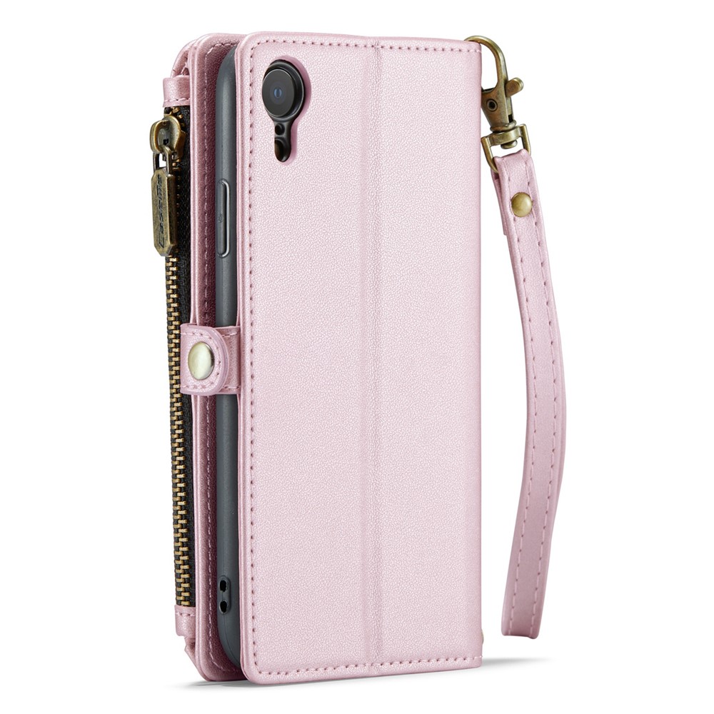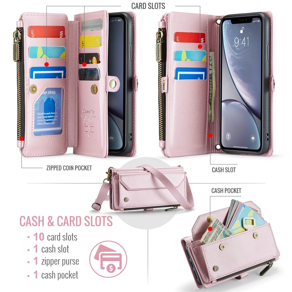 For iPhone XR Leather Case CASEME C36 Zipper Multiple Card Slots Phone Cover with Straps – Pink