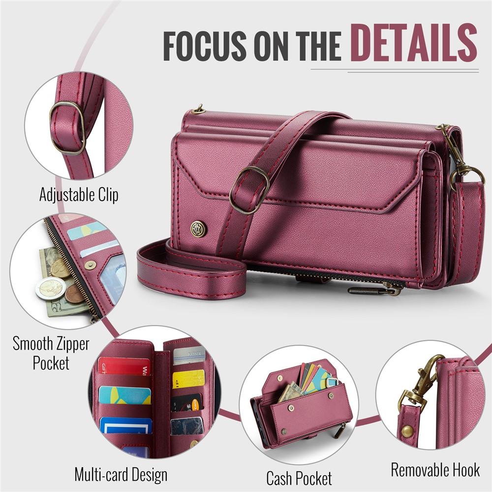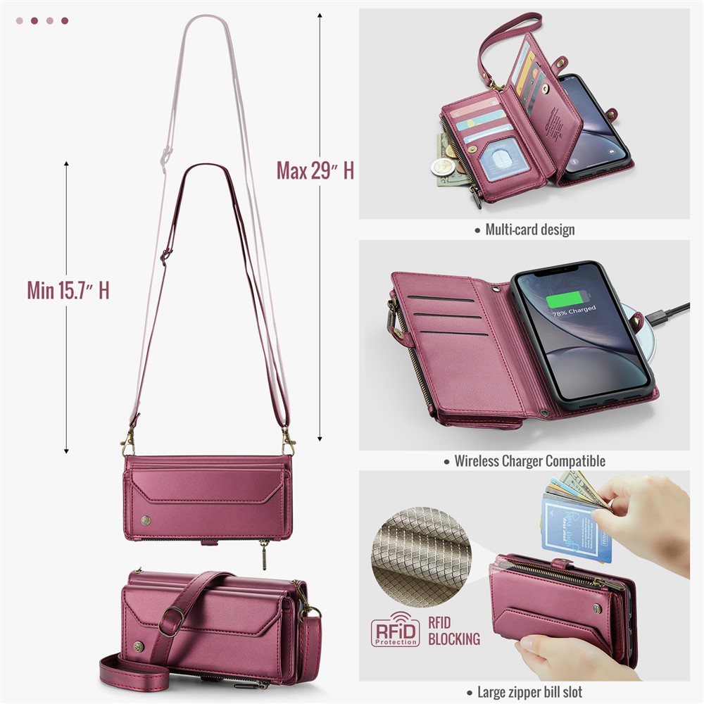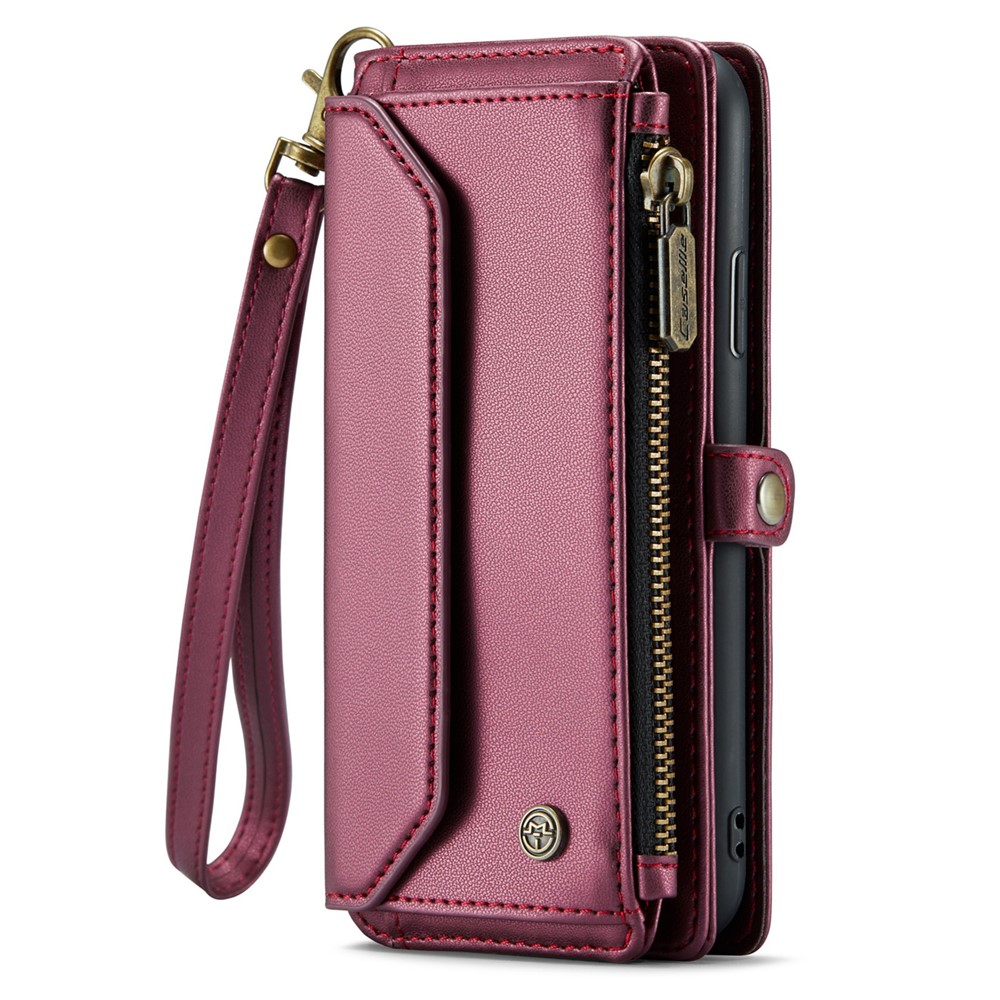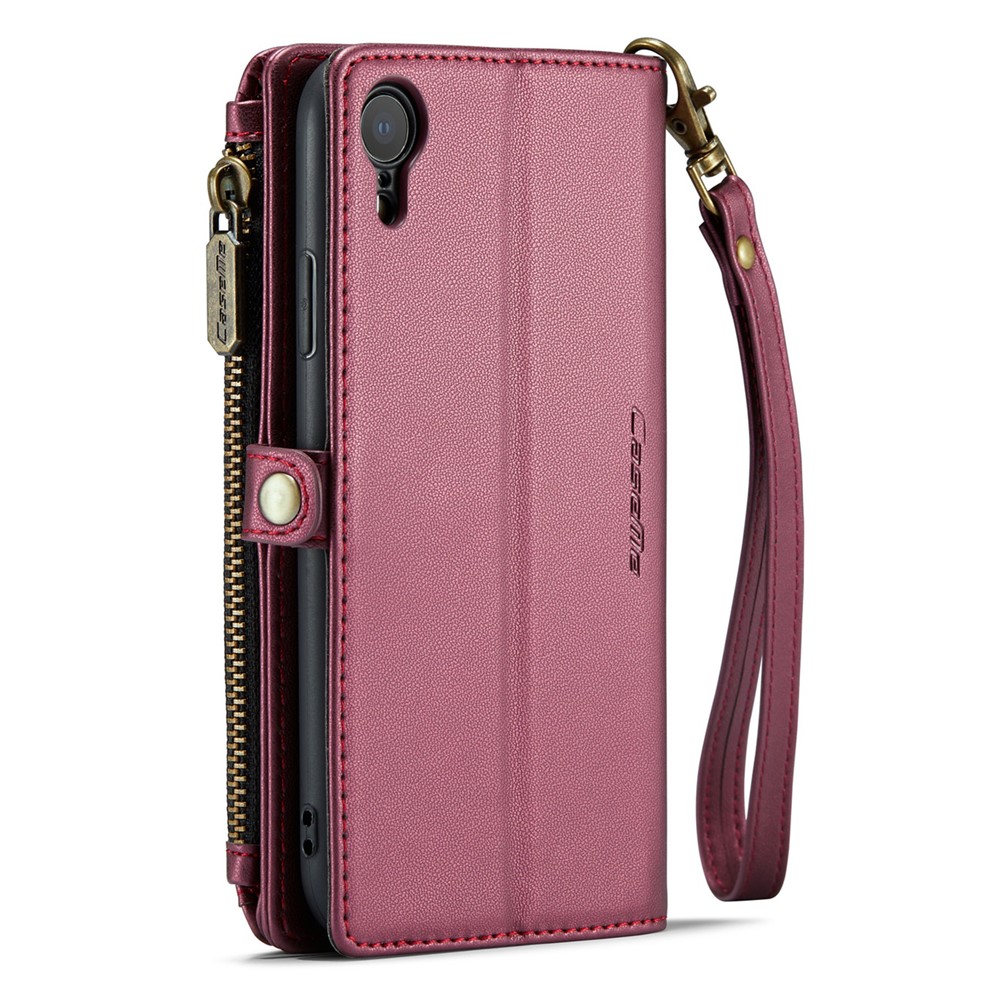 For iPhone XR Leather Case CASEME C36 Zipper Multiple Card Slots Phone Cover with Straps – Wine Red