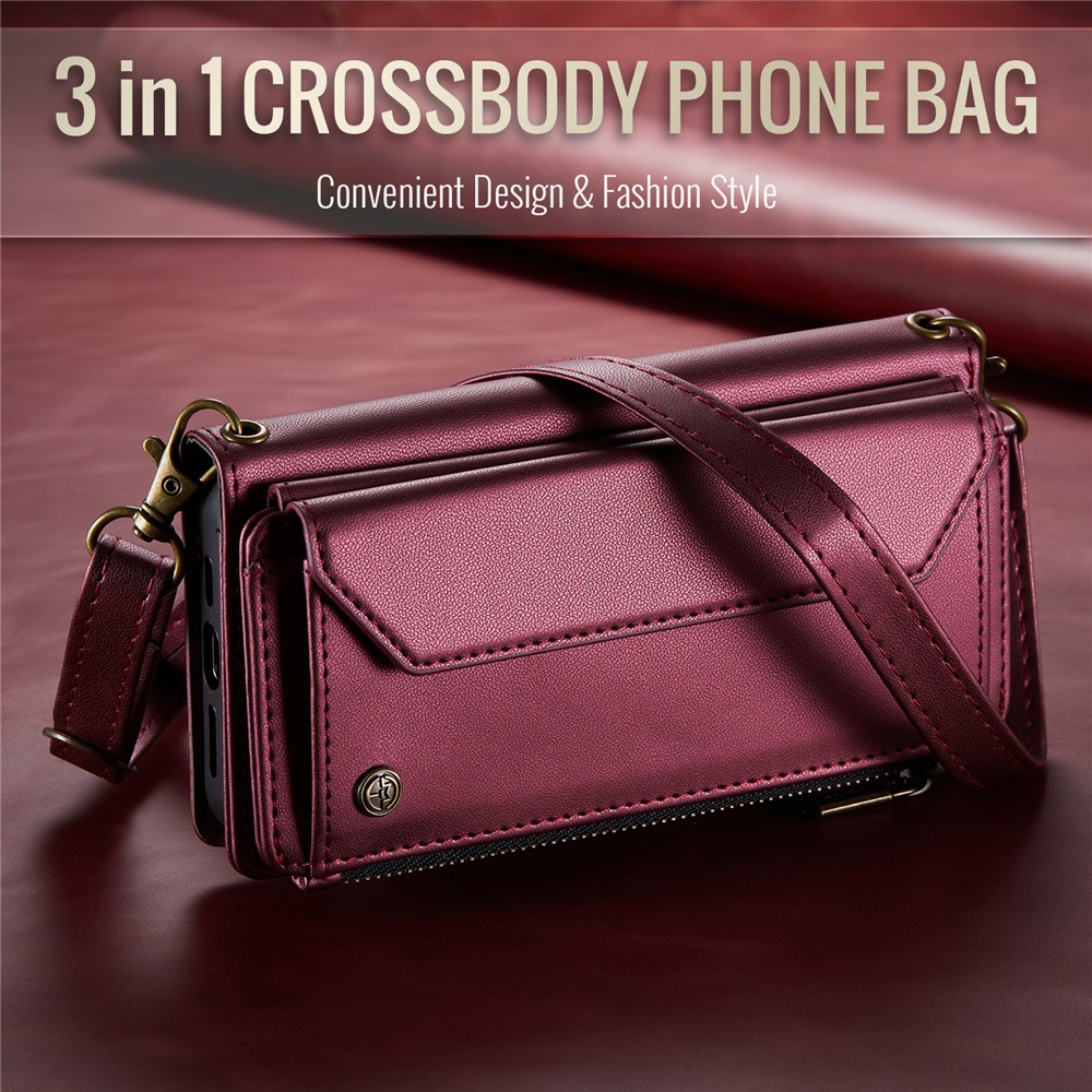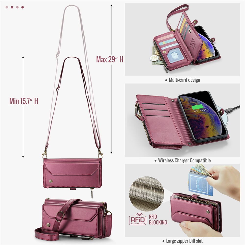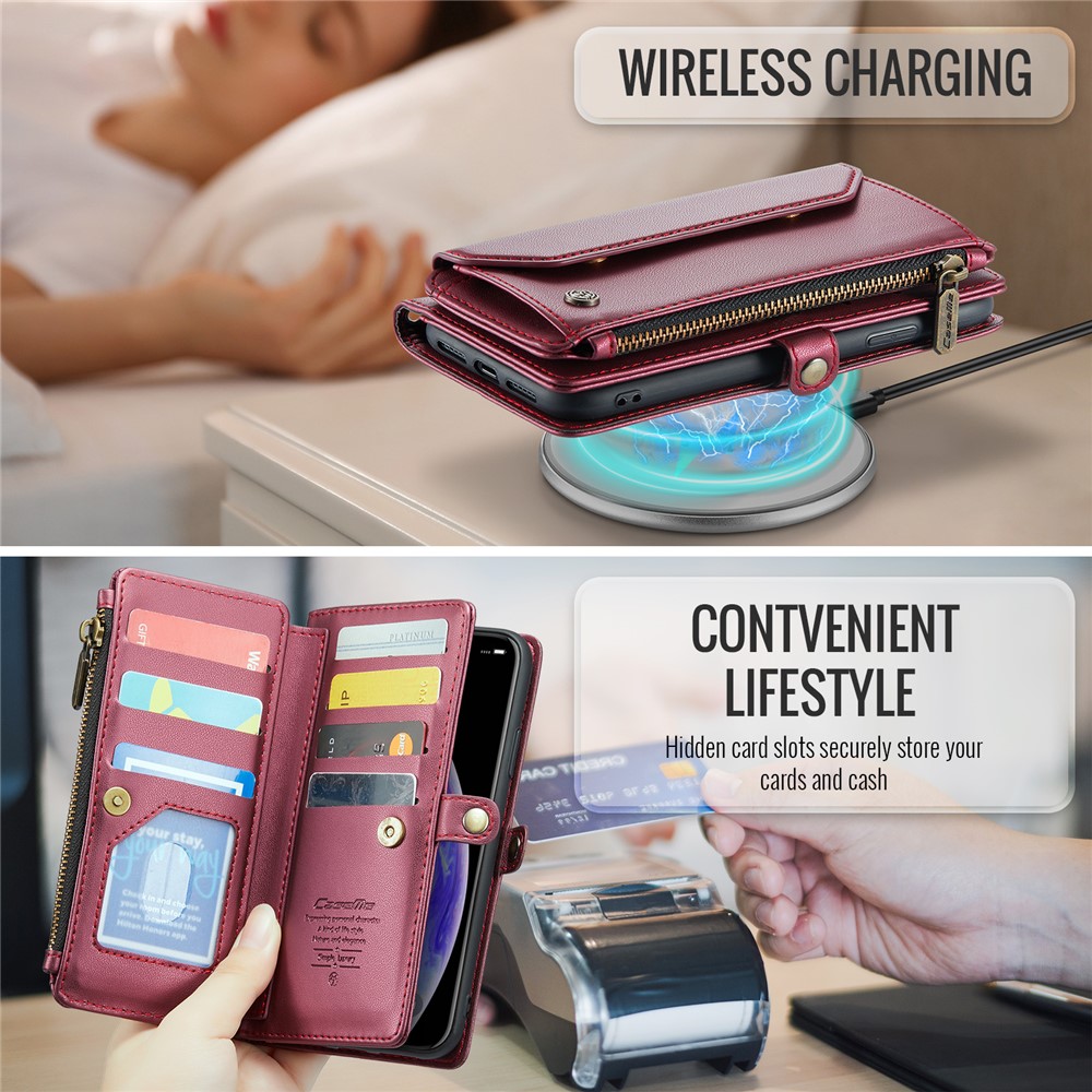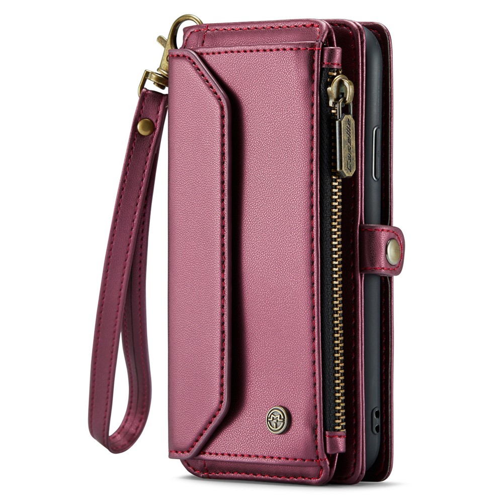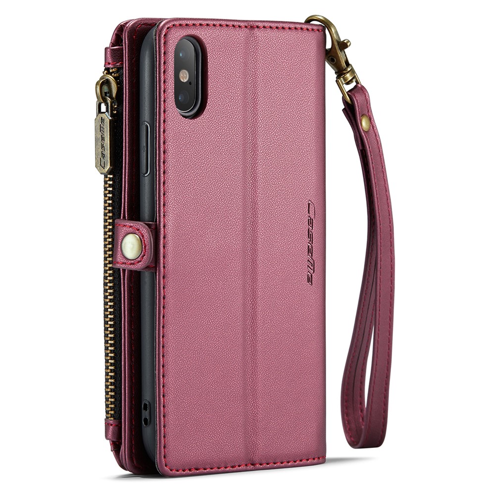 For iPhone XS Max Leather Case CASEME C36 Zipper Multiple Card Slots Phone Cover with Straps – Wine Red
