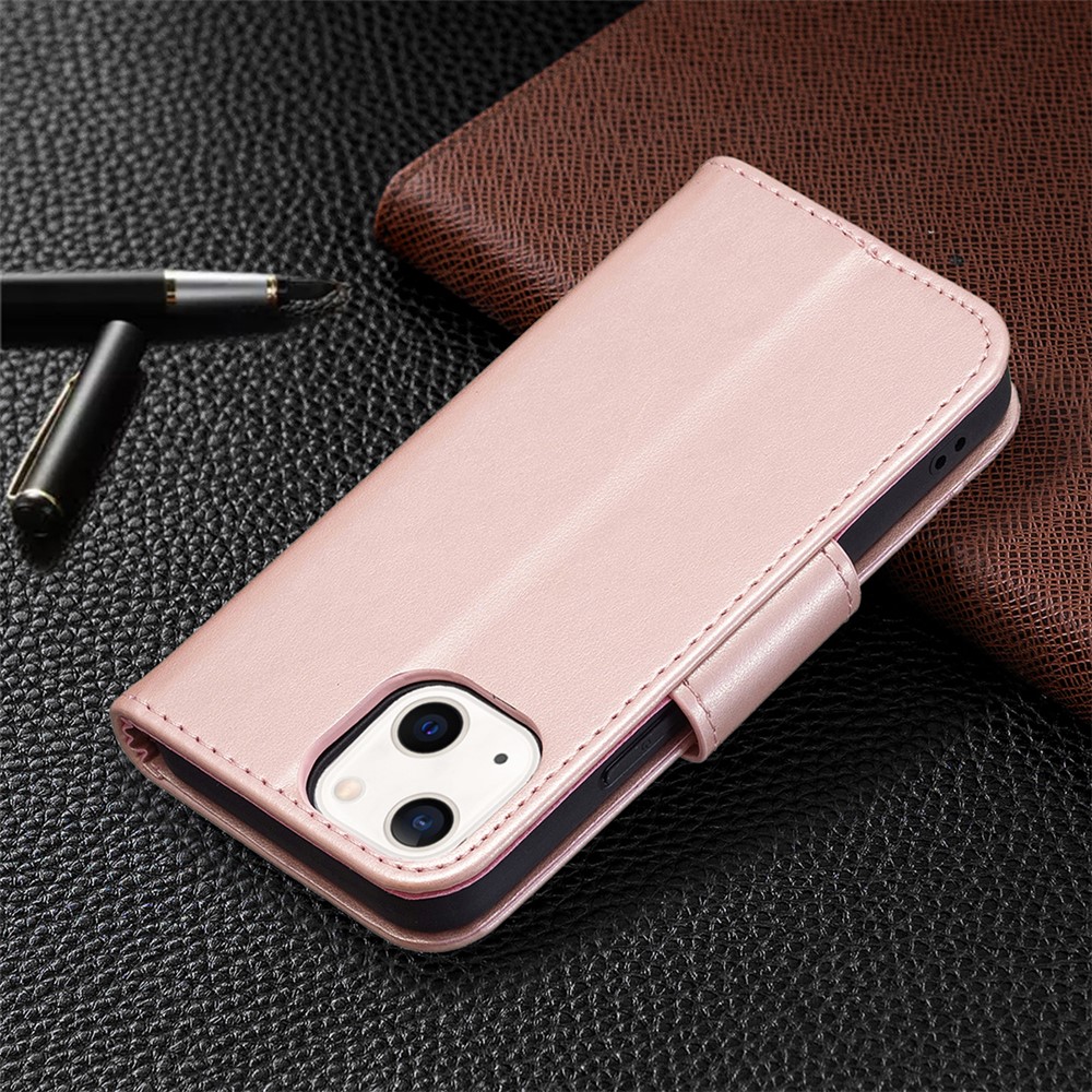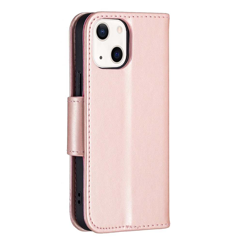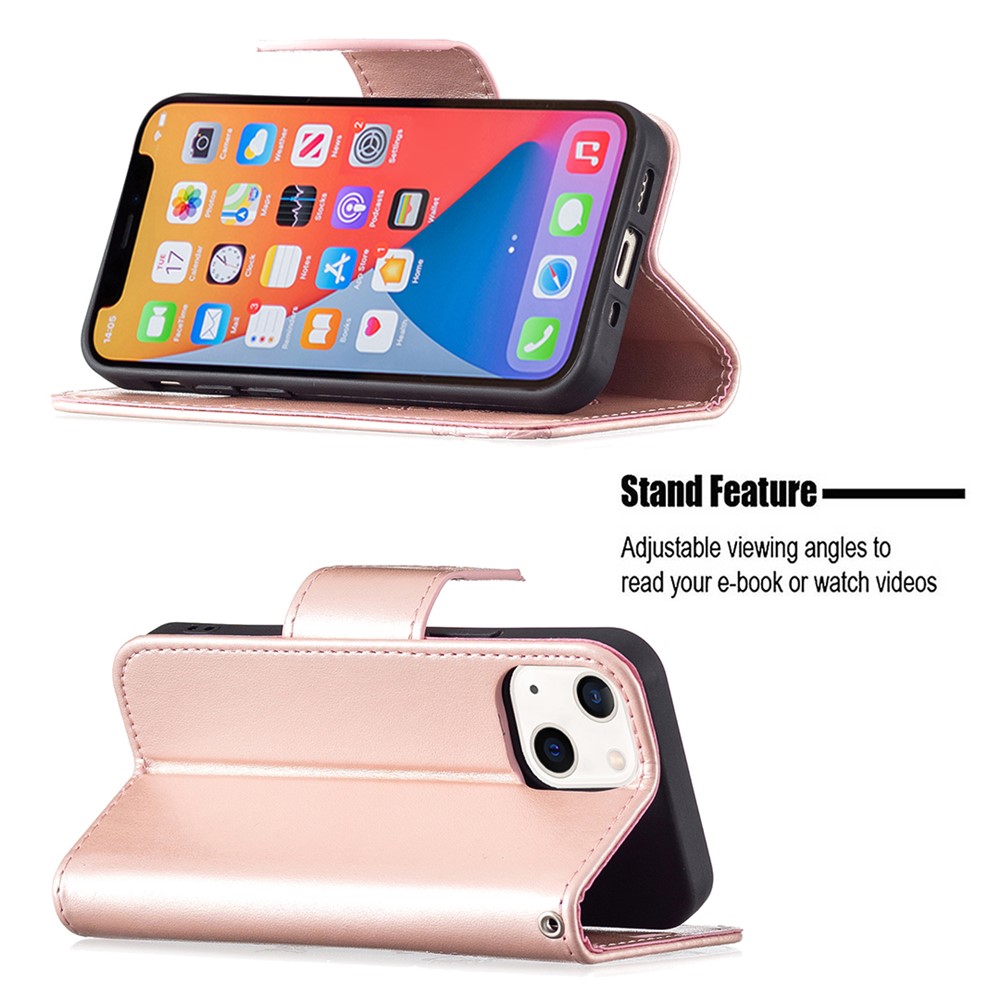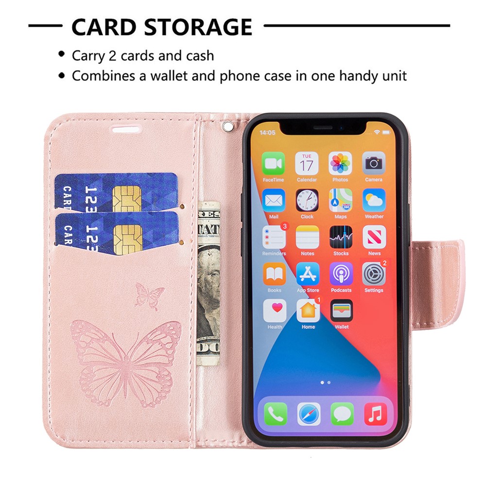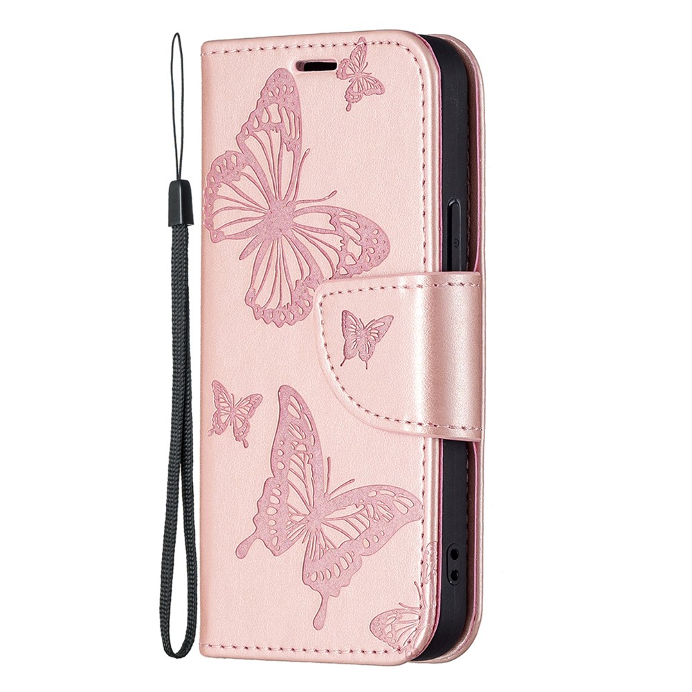 Imprint Butterfly Magnetic Closure Leather Stand Wallet Phone Shell Case with Strap for iPhone 13 mini 5.4 inch – Gold