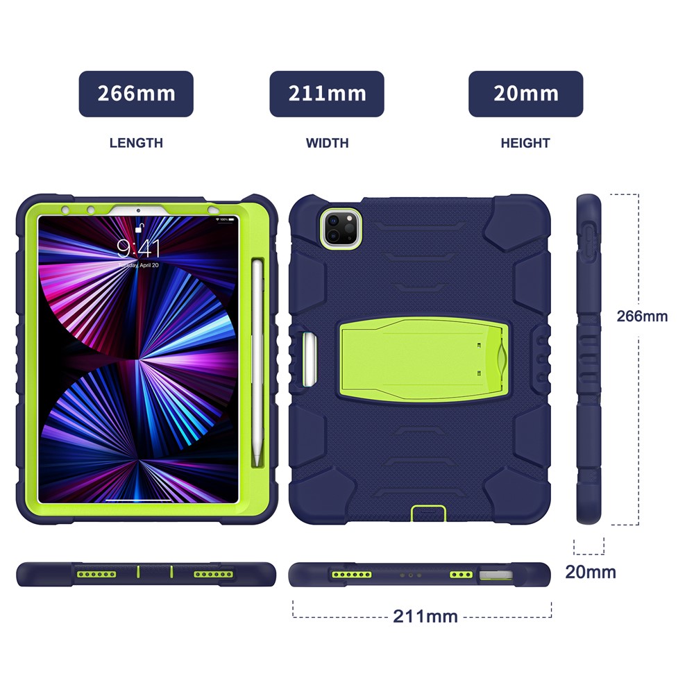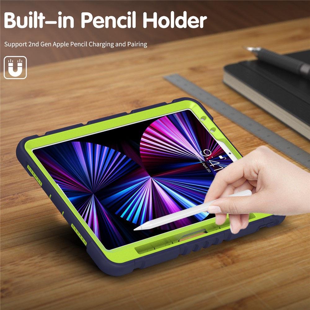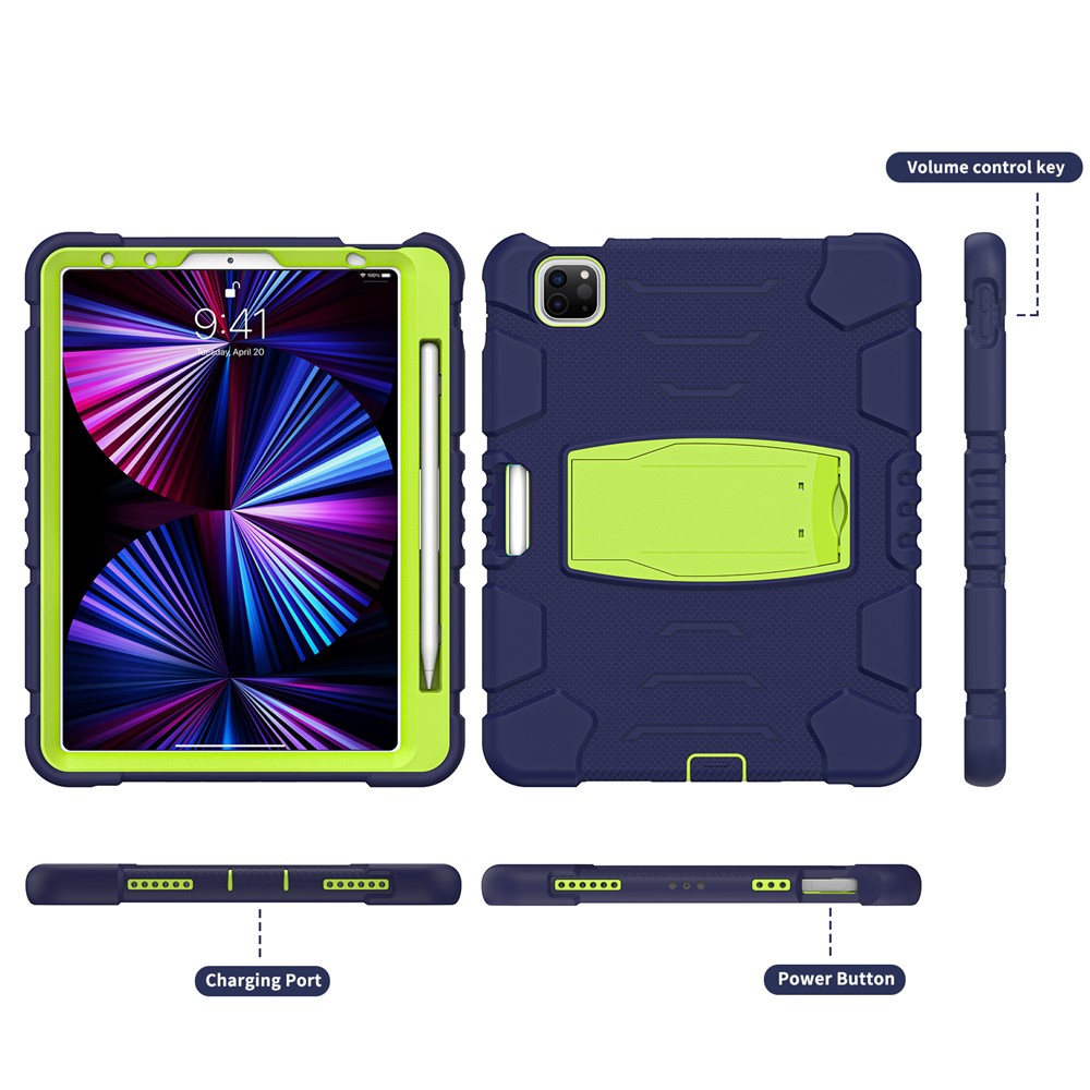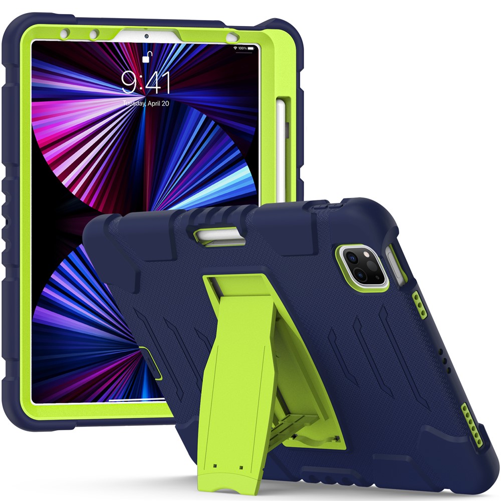 Kickstand Design Drop-Proof Hybrid Tablet Cover with Stylus Pen Magnetic Pairing and Charging Function for iPad Pro 11 (2022) / (2021) / (2020) / (2018) / Air (2020) / Air (2022) – Navy Blue / Lime