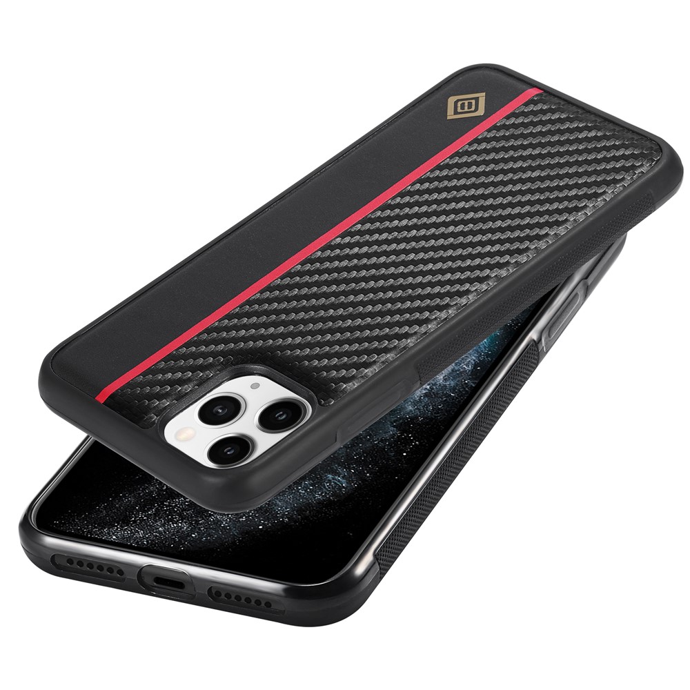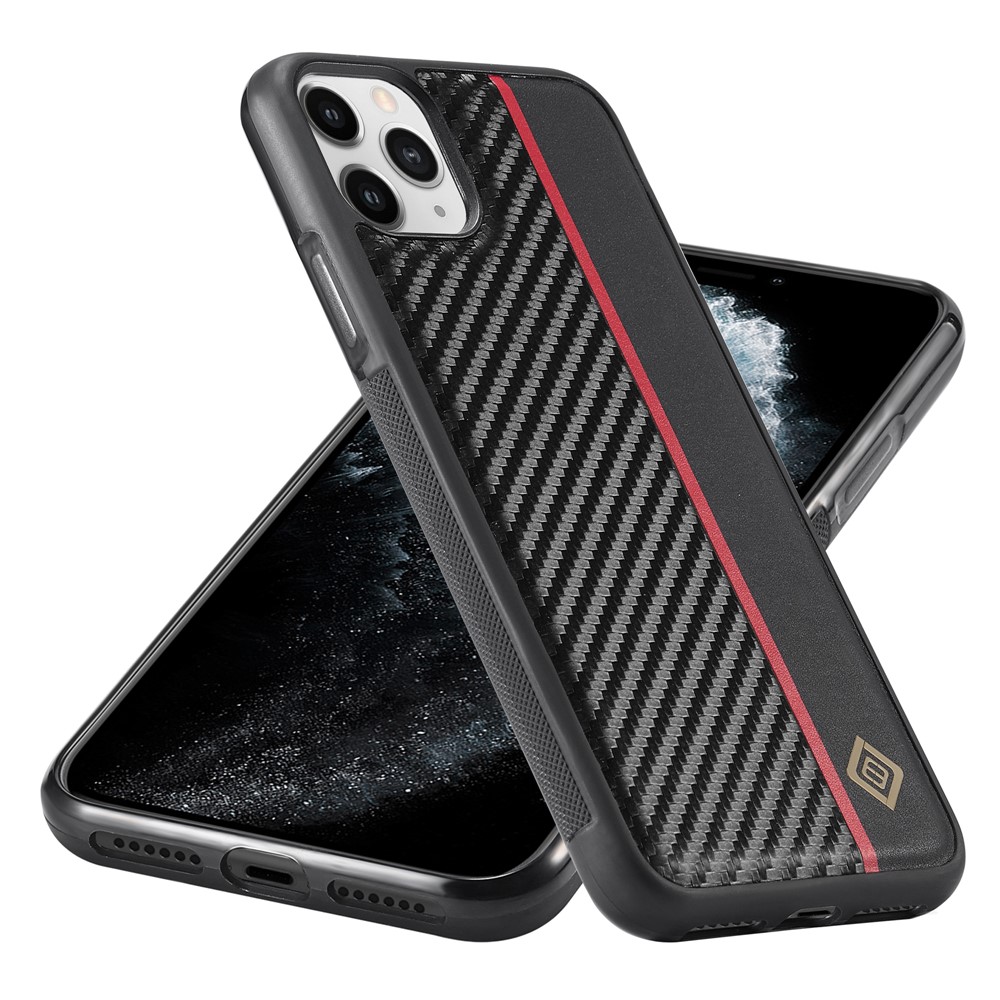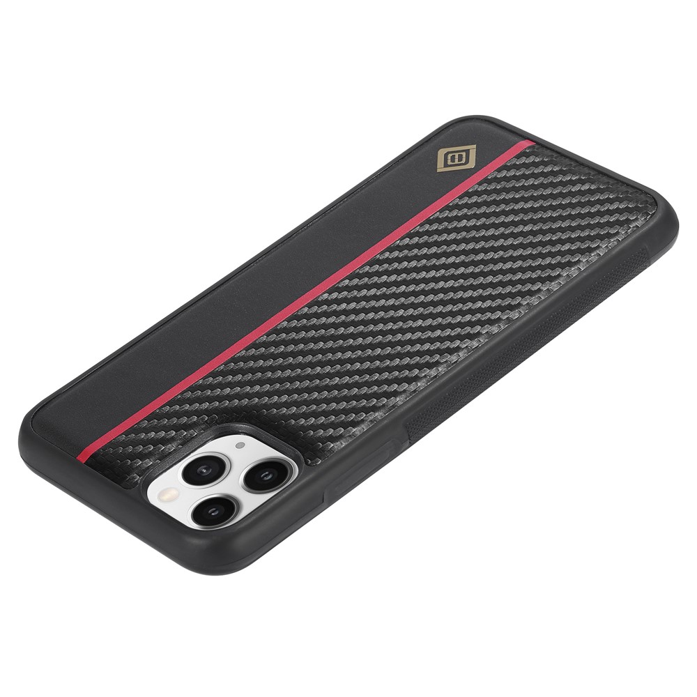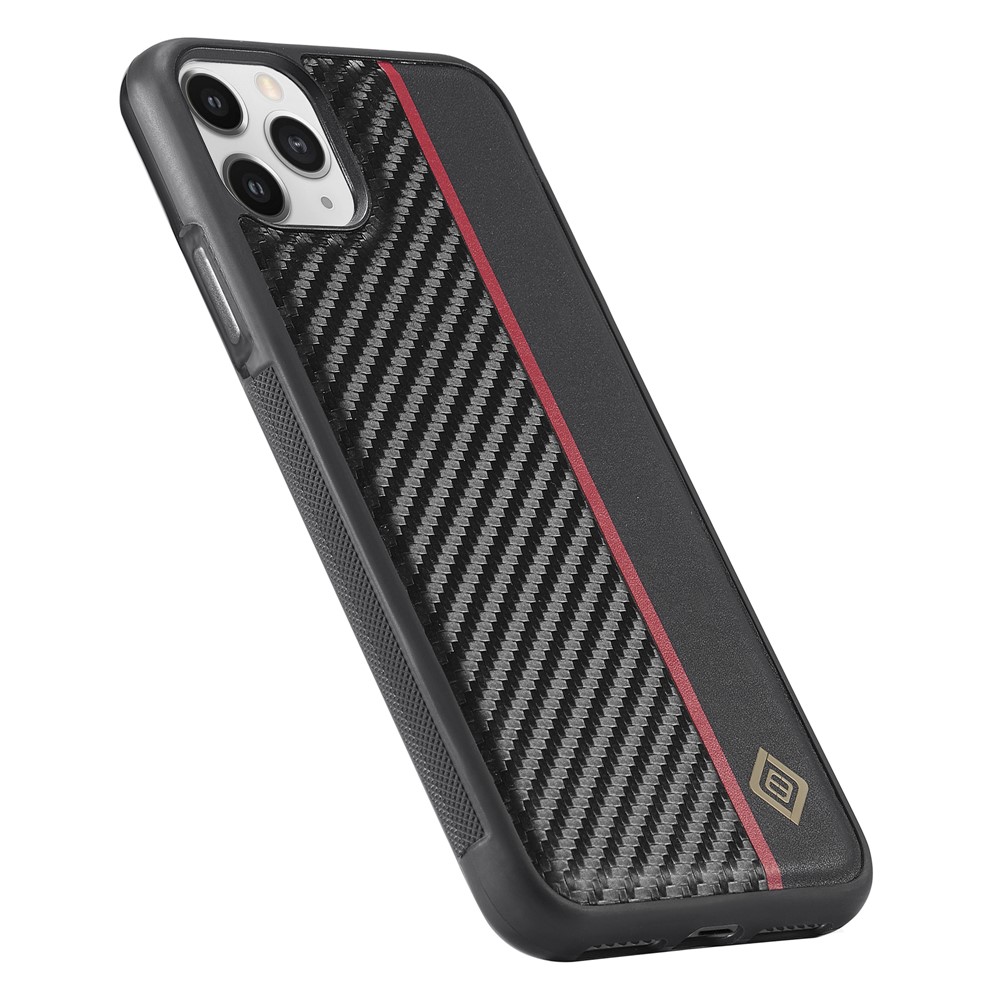 - Carbon Fiber PU Leather with Red Stripe The case combines sleek carbon fiber PU leather with a fine-texture PU leather section, accentuated by a striking red vertical stripe, creating a modern and stylish appearance