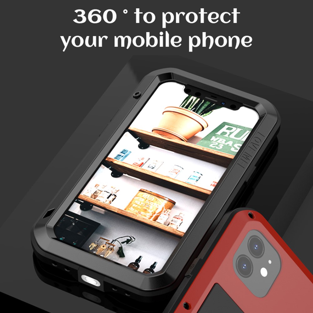 • LOVE MEI For iPhone 12 Full Body Protective Cover Shockproof Metal + Silicone Phone Case with Tempered Glass Film - Red