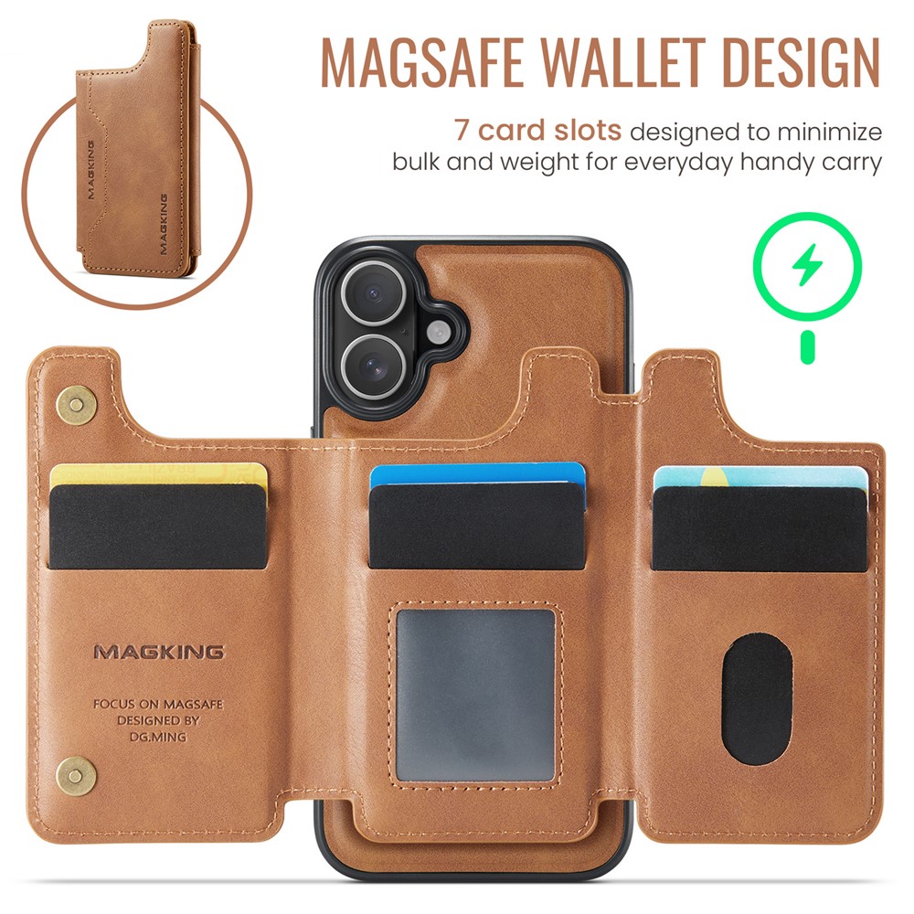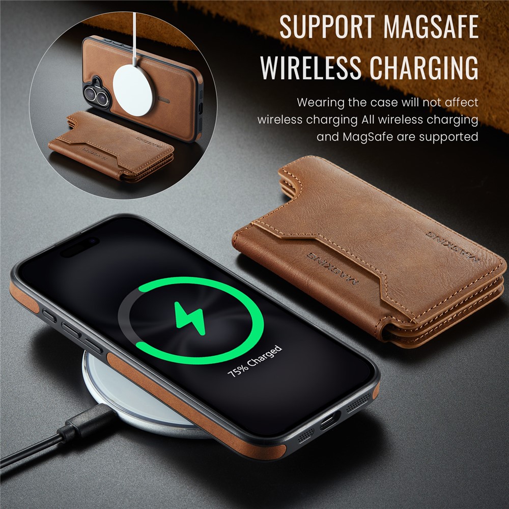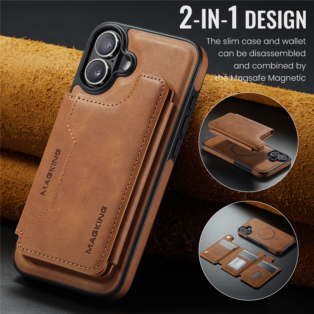 MAGKING K3 Series For iPhone 16 Plus Case Compatible with MagSafe Wallet PC + TPU + PU Phone Cover – Brown