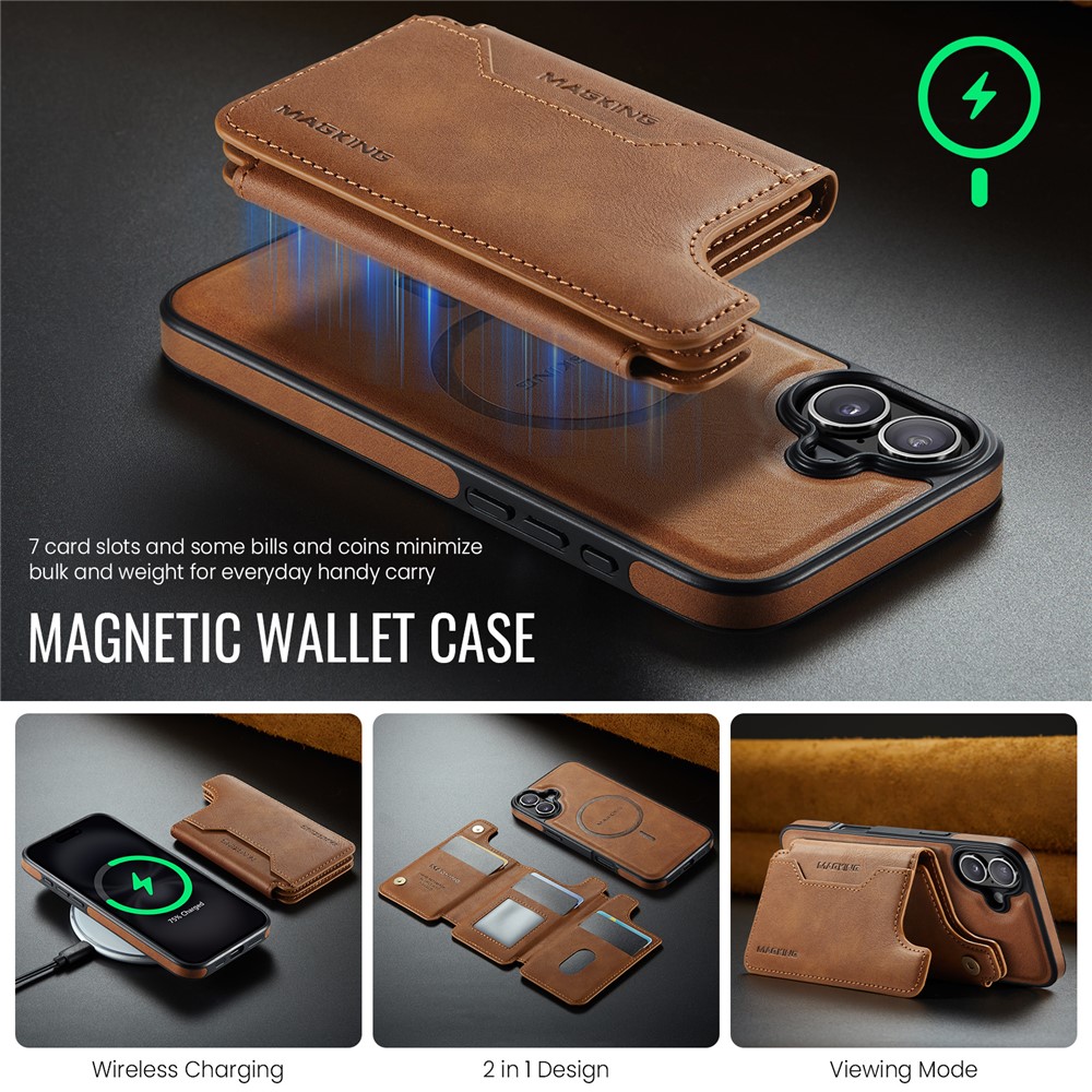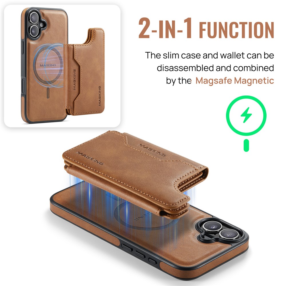 MAGKING K3 Series For iPhone 16 Plus Case Compatible with MagSafe Wallet PC + TPU + PU Phone Cover - Brown