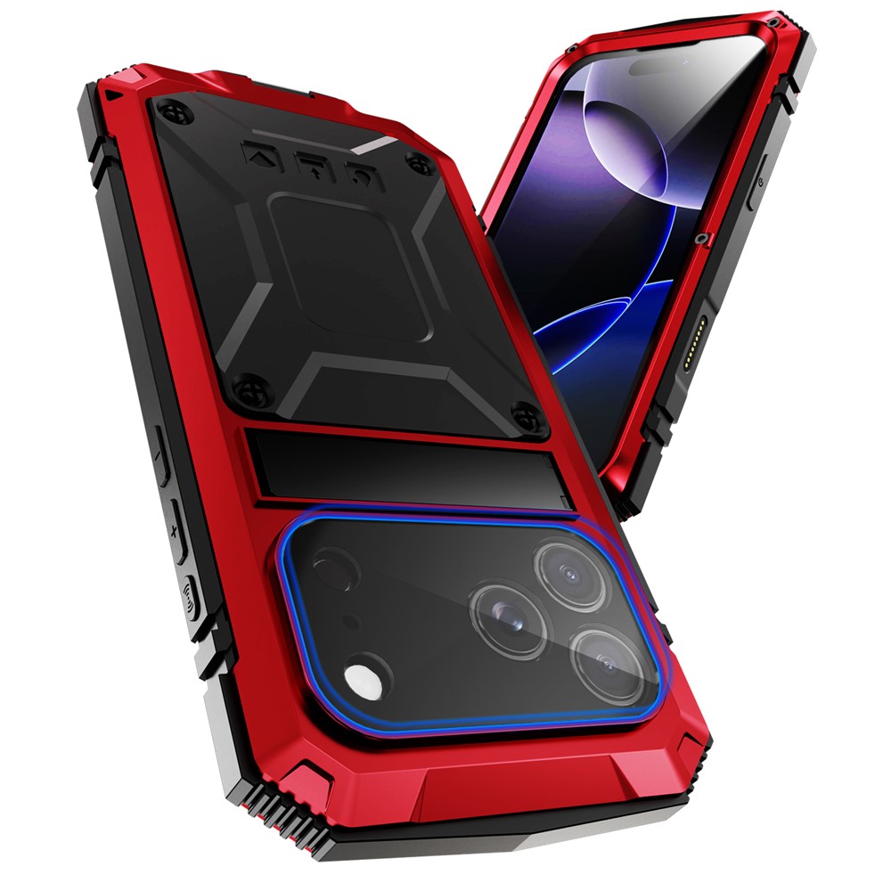 R-JUST For iPhone 17 Pro Max Case PC + Silicone + Metal Kickstand Phone Cover with Tempered Glass Film – Red