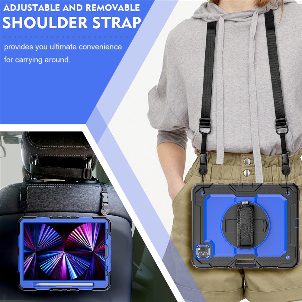 Rugged Heavy Duty PC + Silicone Shockproof 360° Rotating Kickstand Cover with Handle Hand Grip and Shoulder Strap for iPad Pro 11-inch (2021) / (2022) - Black / Blue