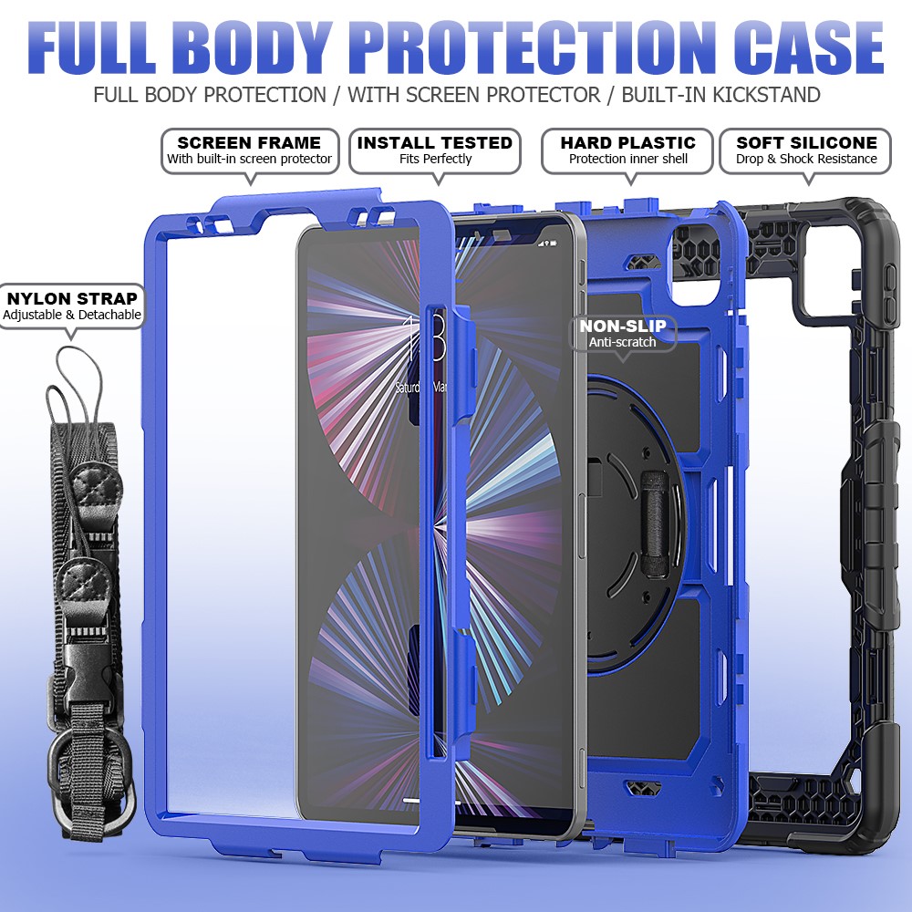 Rugged Heavy Duty PC + Silicone Shockproof 360° Rotating Kickstand Cover with Handle Hand Grip and Shoulder Strap for iPad Pro 11-inch (2021) / (2022) – Black / Blue