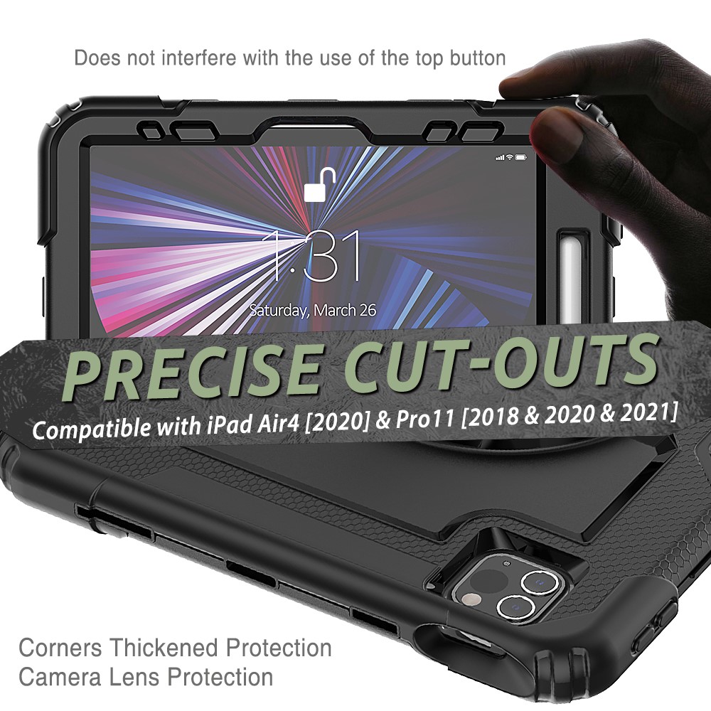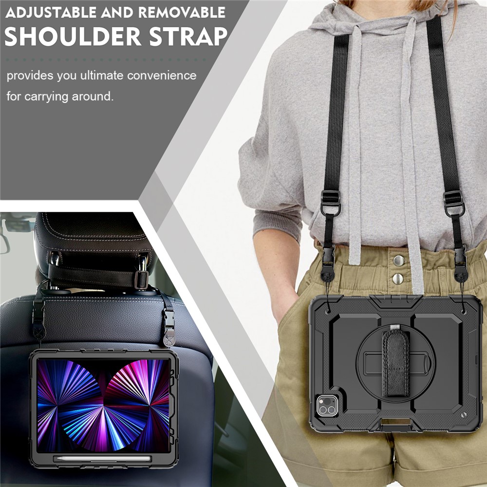 Rugged Heavy Duty PC + Silicone Shockproof 360° Rotating Kickstand Cover with Handle Hand Grip and Shoulder Strap for iPad Pro 11-inch (2021) / (2022) - Black