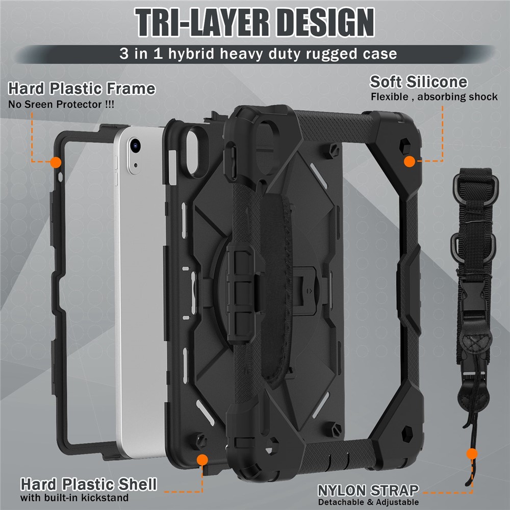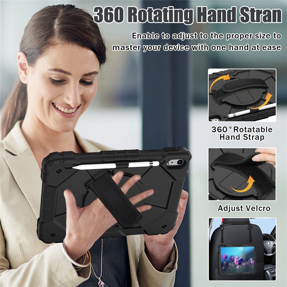 - Folding Kickstand & Hand Strap Features an integrated folding kickstand, allowing hands-free viewing; There is a handy strap on the back of the case, supporting 360-degree rotating, and you can hold your tablet in one hand