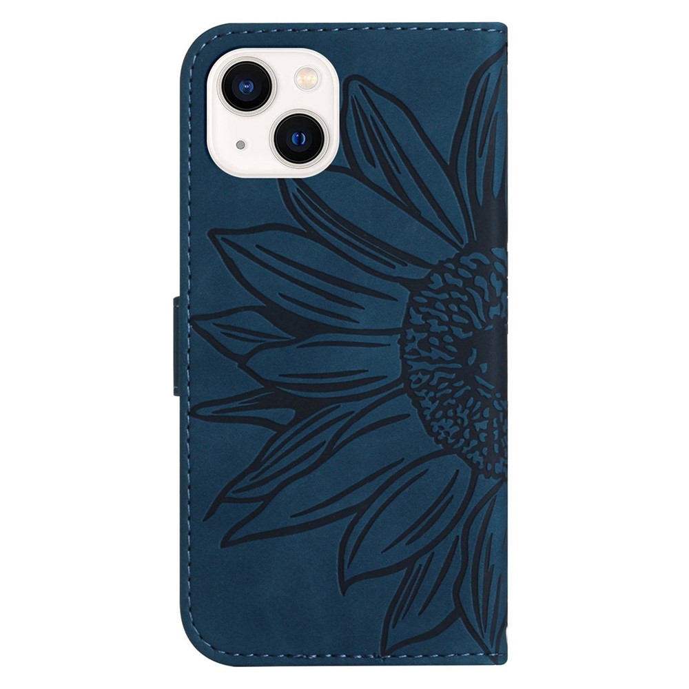 • Skin-Touch Feeling Flip Phone Case for iPhone 13 mini, HT04 Imprinted Sunflower Stand PU Leather Magnetic Wallet Cover with Strap - Sapphire