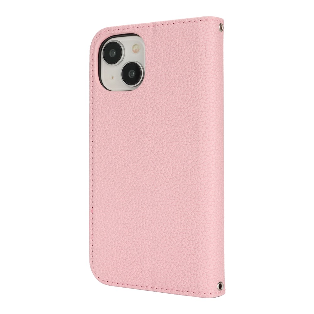 Stand Case for iPhone 14 / 13 Litchi Texture Leather Flip Phone Cover with Strap  /  Wallet - Pink