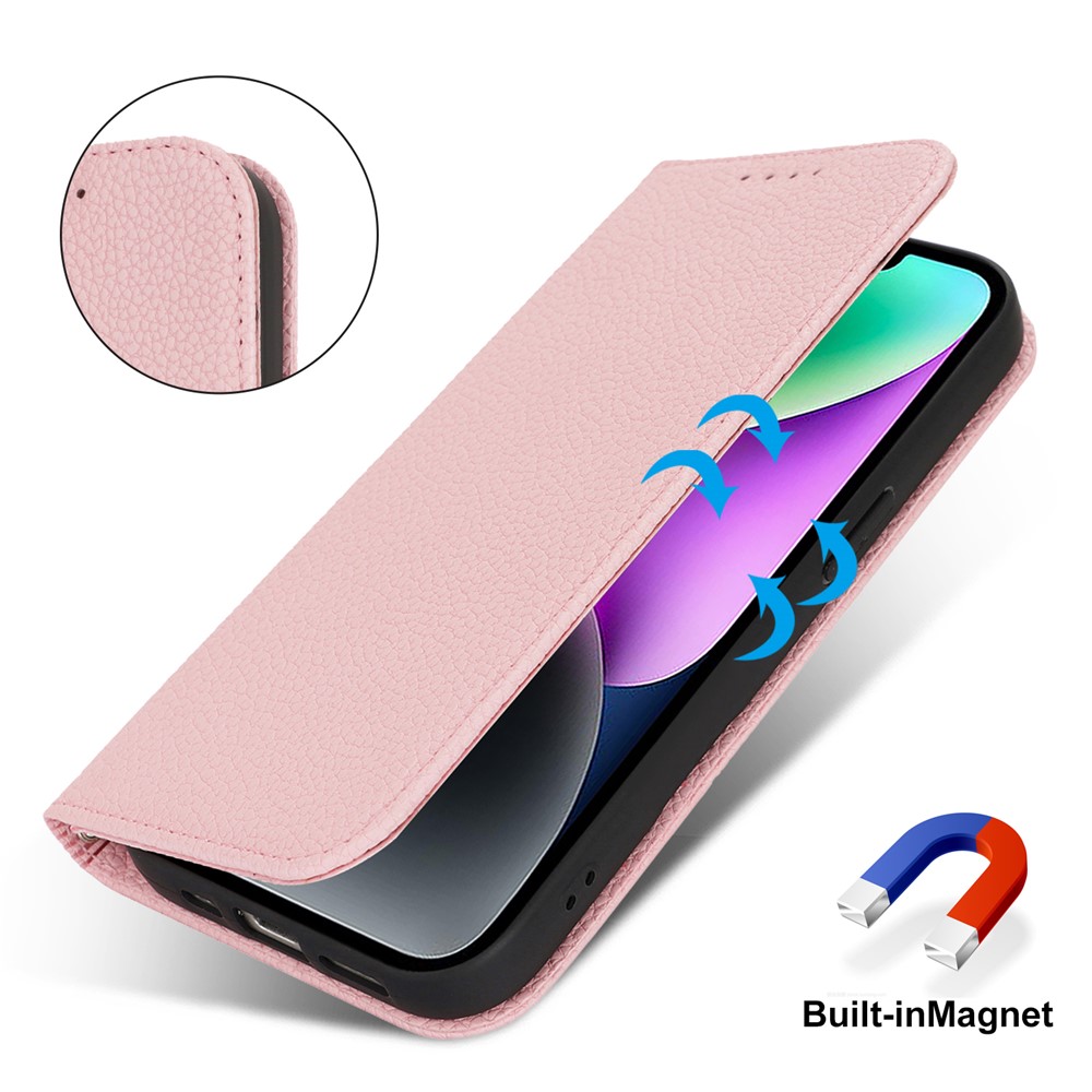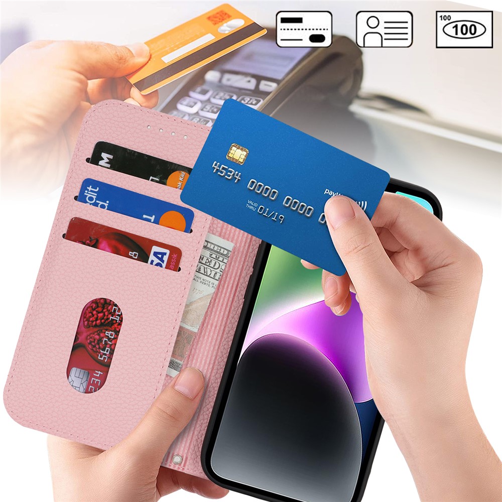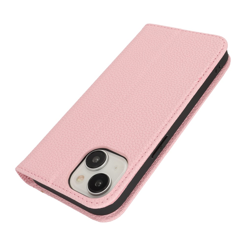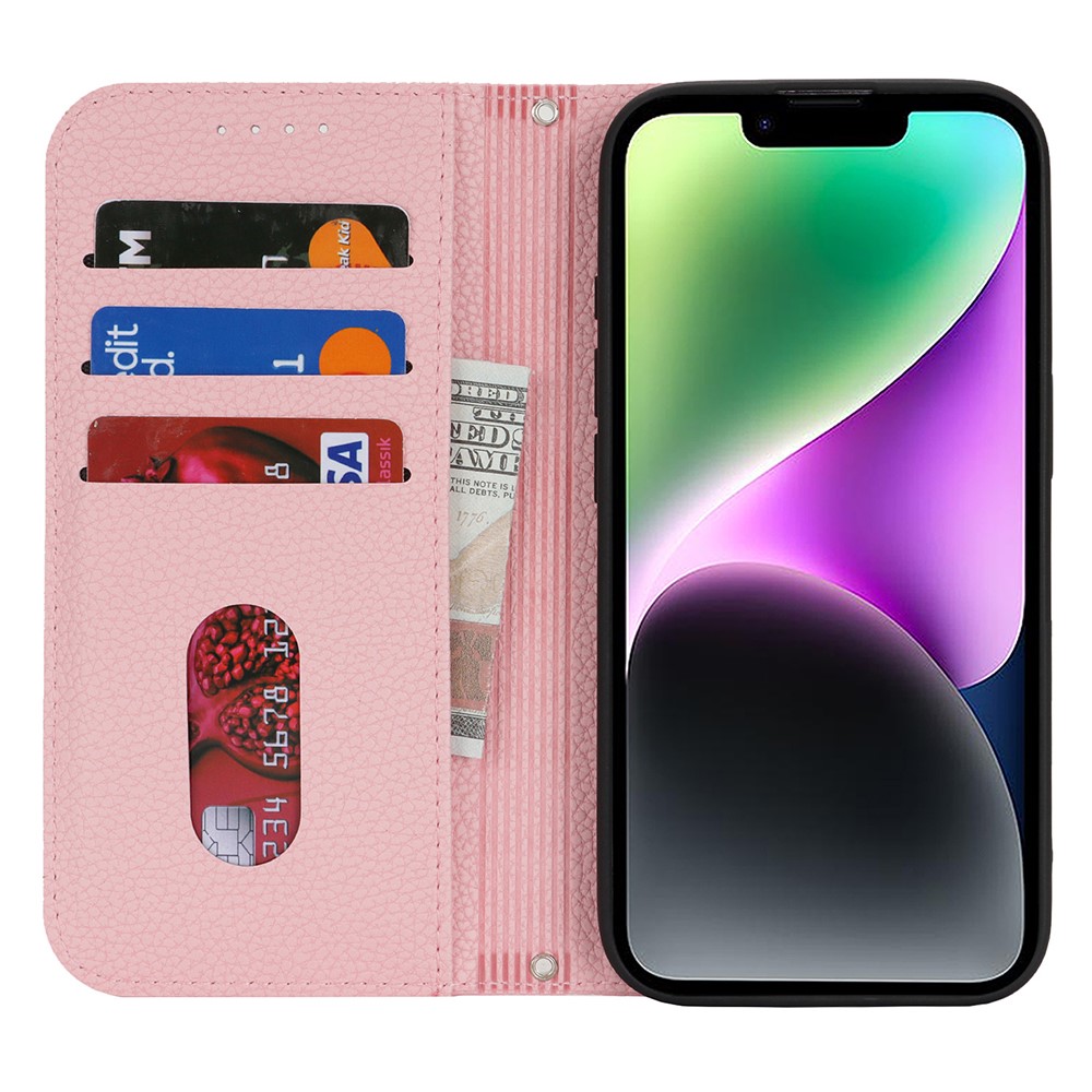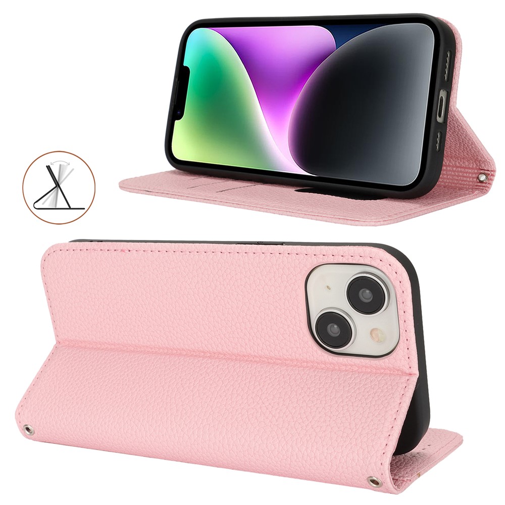Stand Case for iPhone 14 / 13 Litchi Texture Leather Flip Phone Cover with Strap / Wallet – Pink