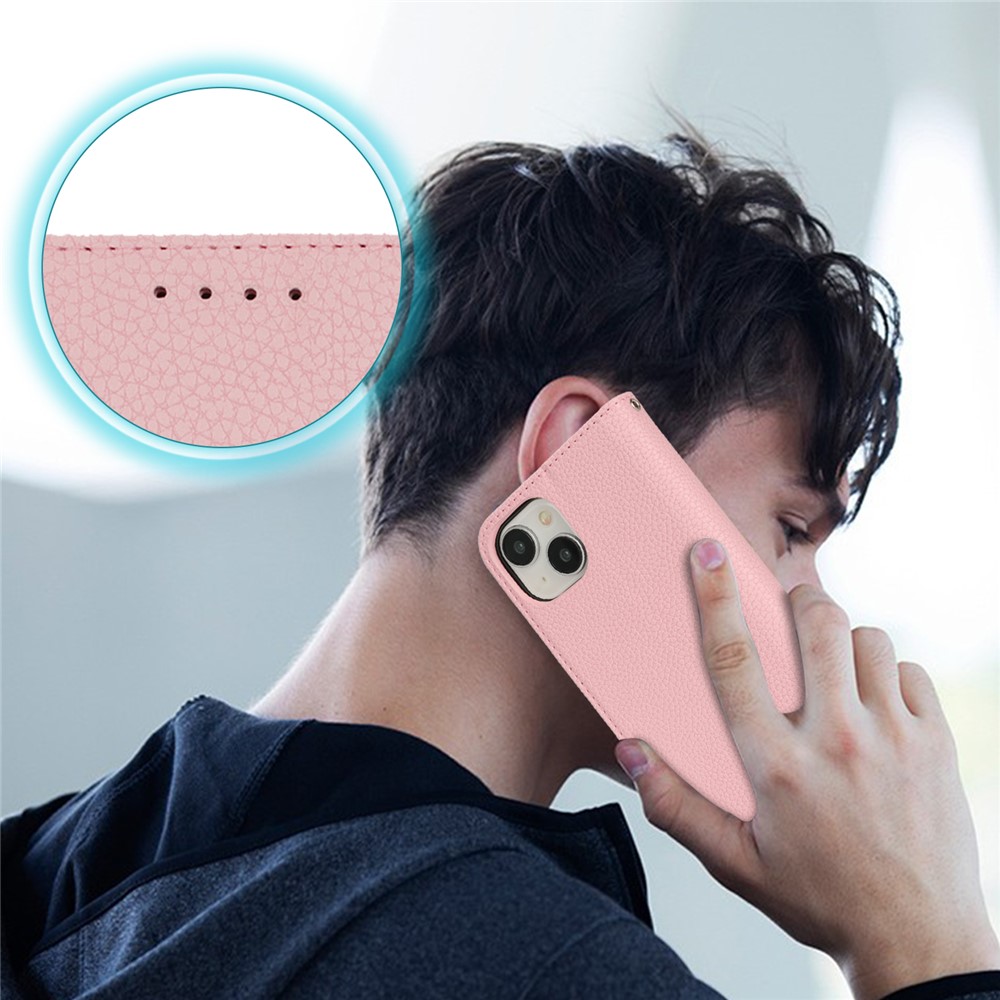 • Stand Case for iPhone 14 / 13 Litchi Texture Leather Flip Phone Cover with Strap  /  Wallet - Rose Gold