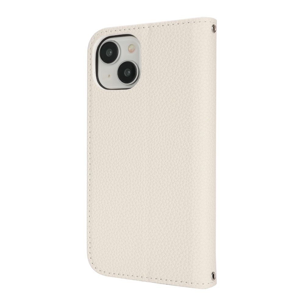 Stand Case for iPhone 15 Litchi Texture Leather Flip Phone Cover with Strap / Wallet – White