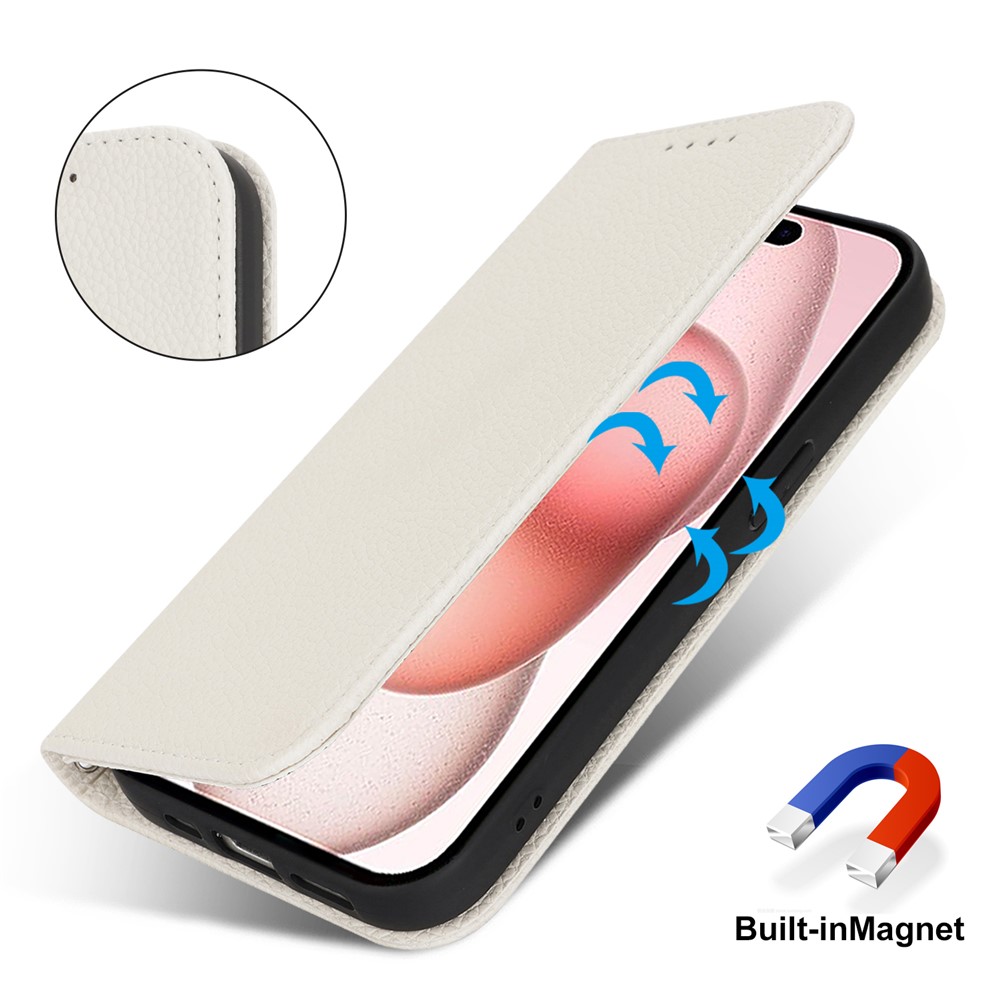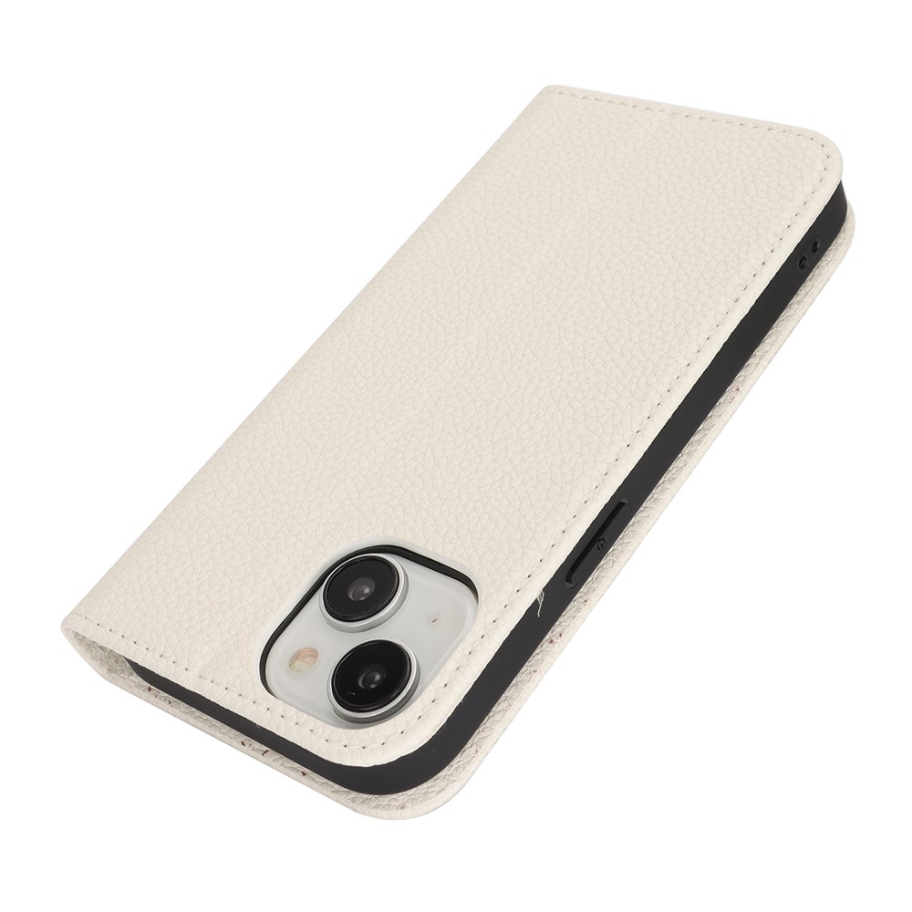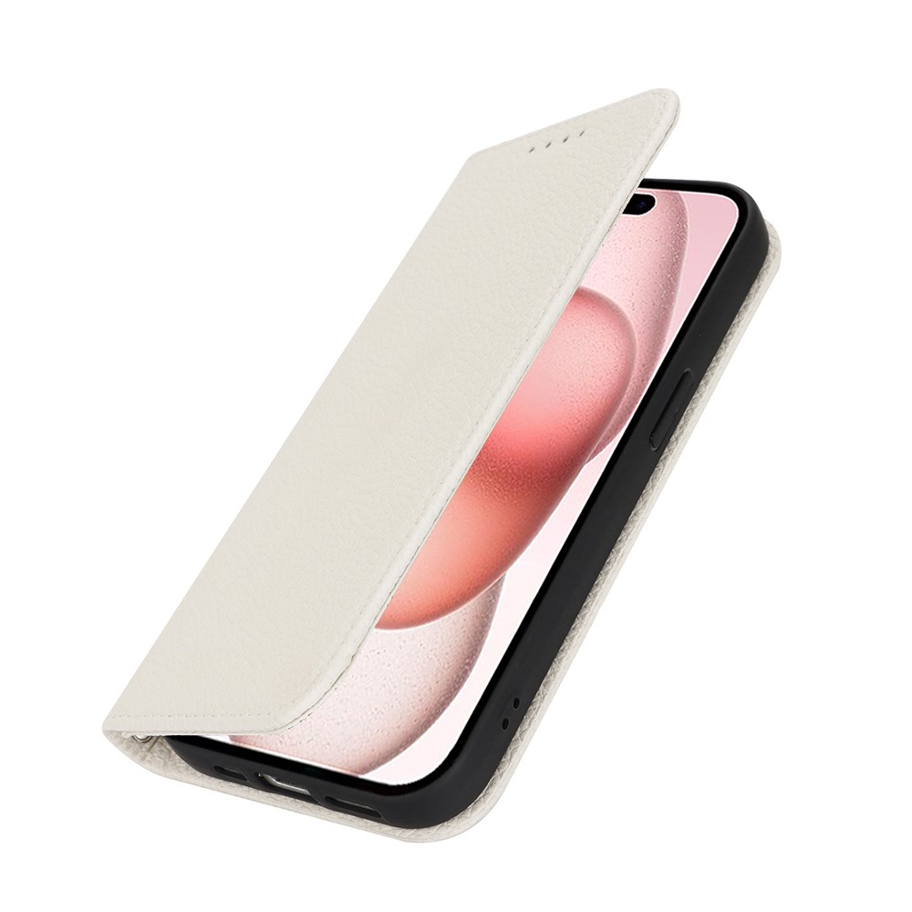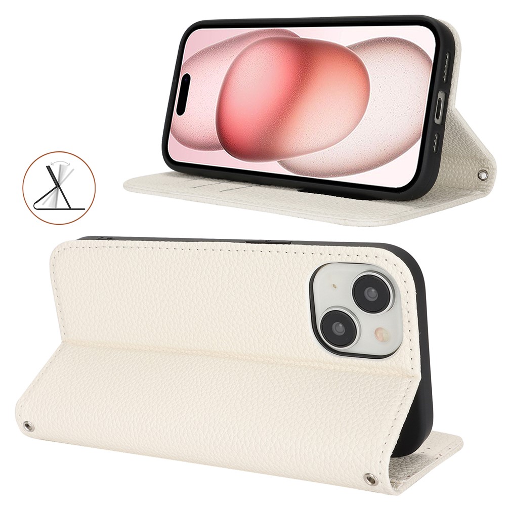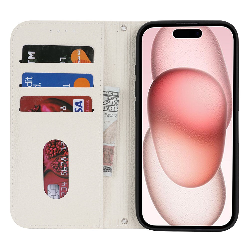 Stand Case for iPhone 15 Litchi Texture Leather Flip Phone Cover with Strap / Wallet - White $18.32