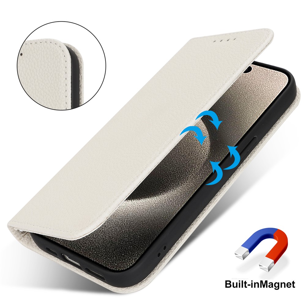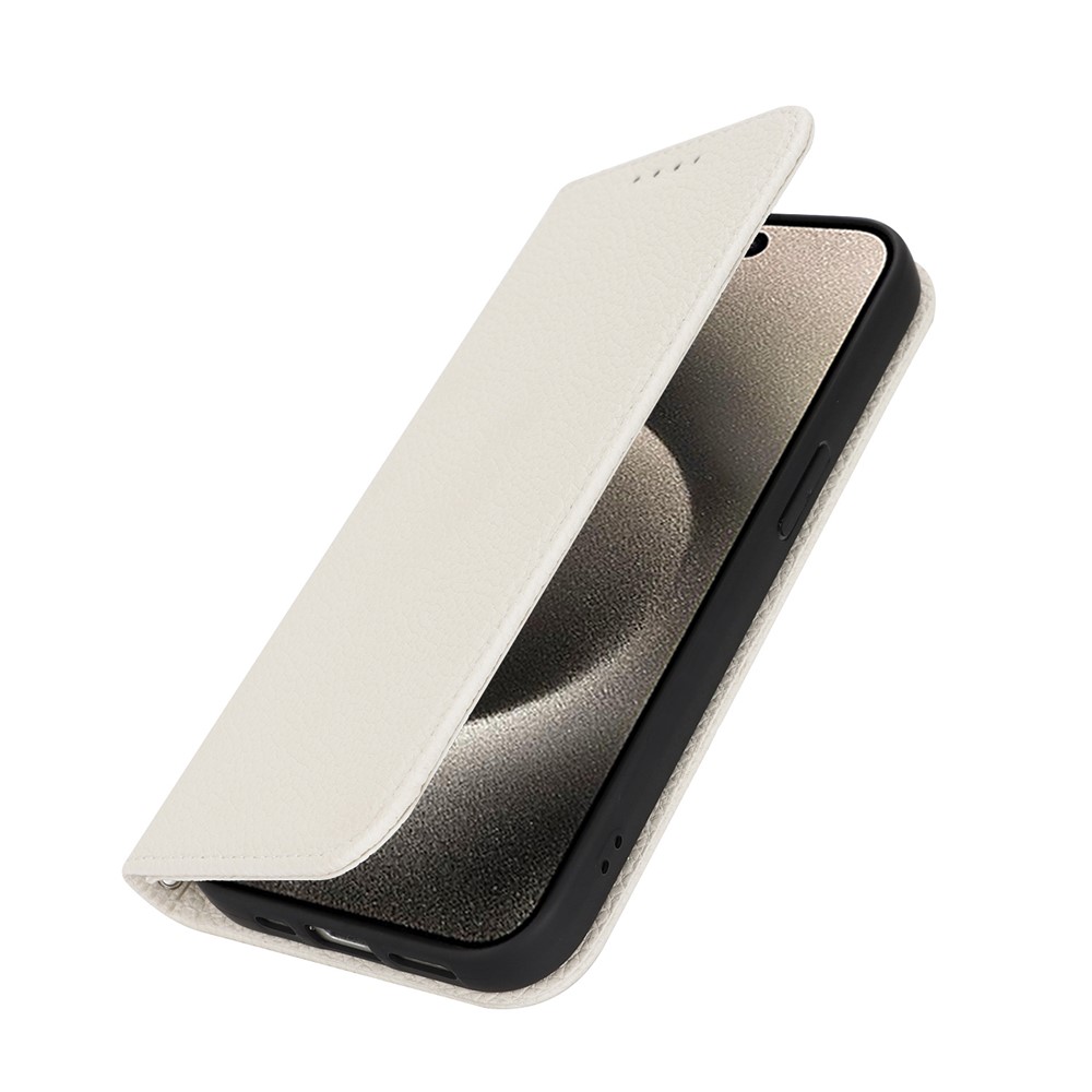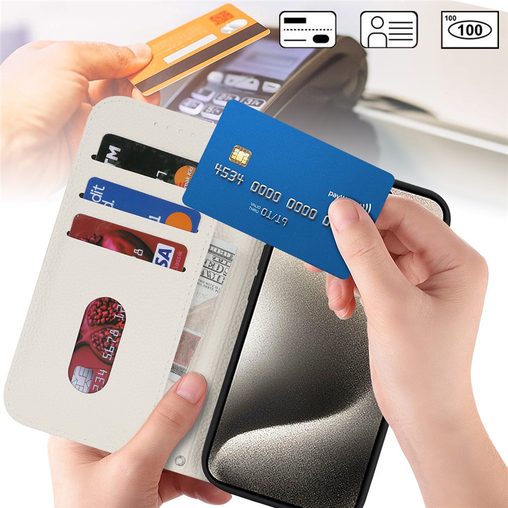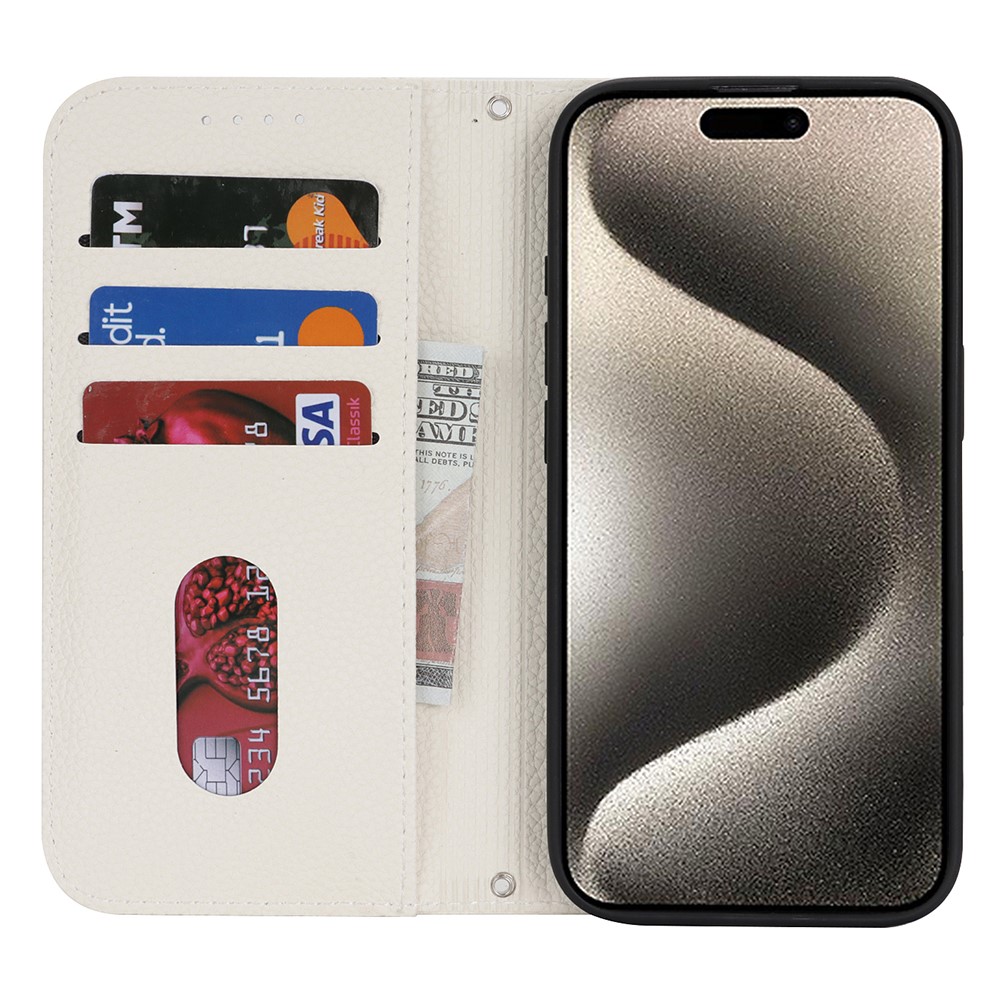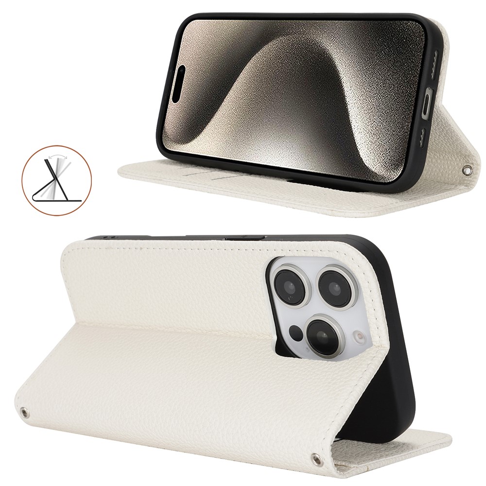Stand Case for iPhone 15 Pro Max Litchi Texture Leather Flip Phone Cover with Strap / Wallet – White