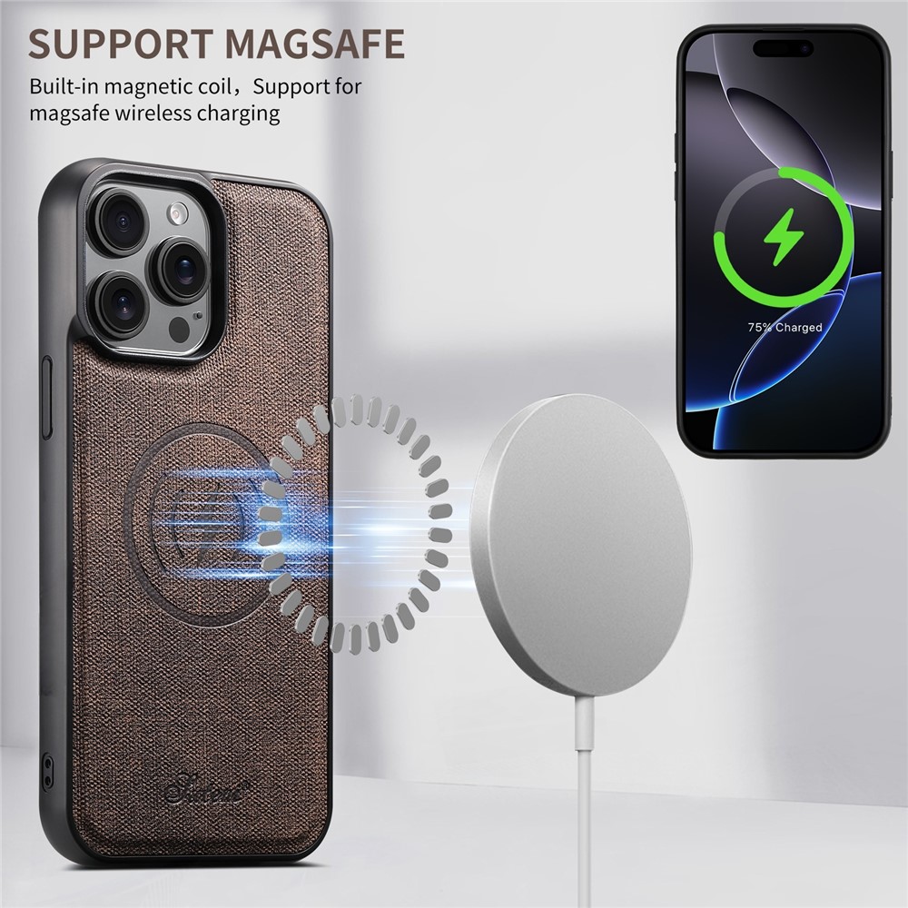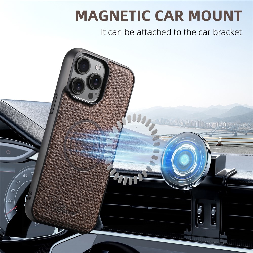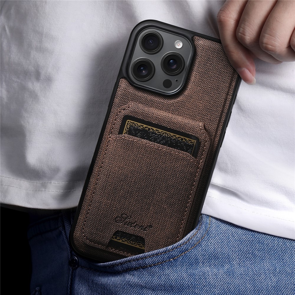 SUTENI H18 For iPhone 15 Pro Magnetic Case Jeans Cloth Texture Leather Back Cover with Card Bag - Brown $20.83