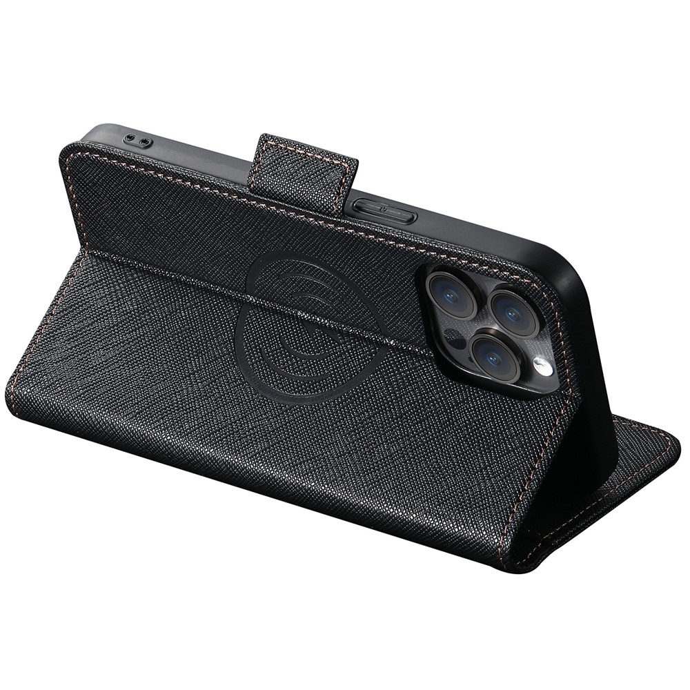 SUTENI J08 For iPhone 13 Pro Max Case Compatible with MagSafe Cross Texture Leather Wallet Phone Cover - Black